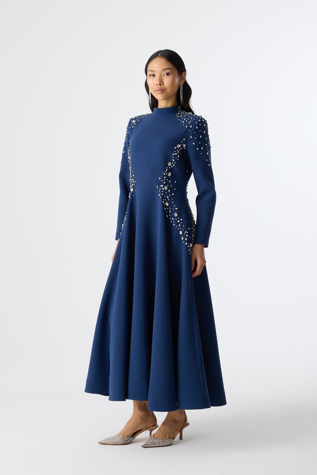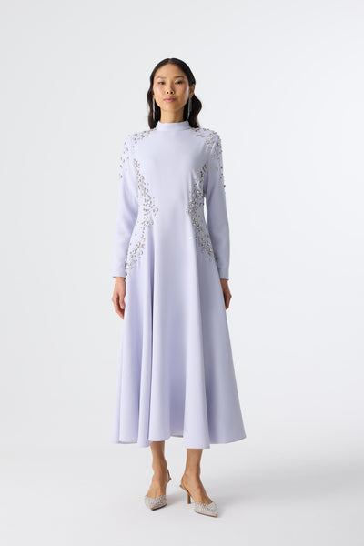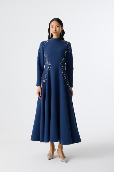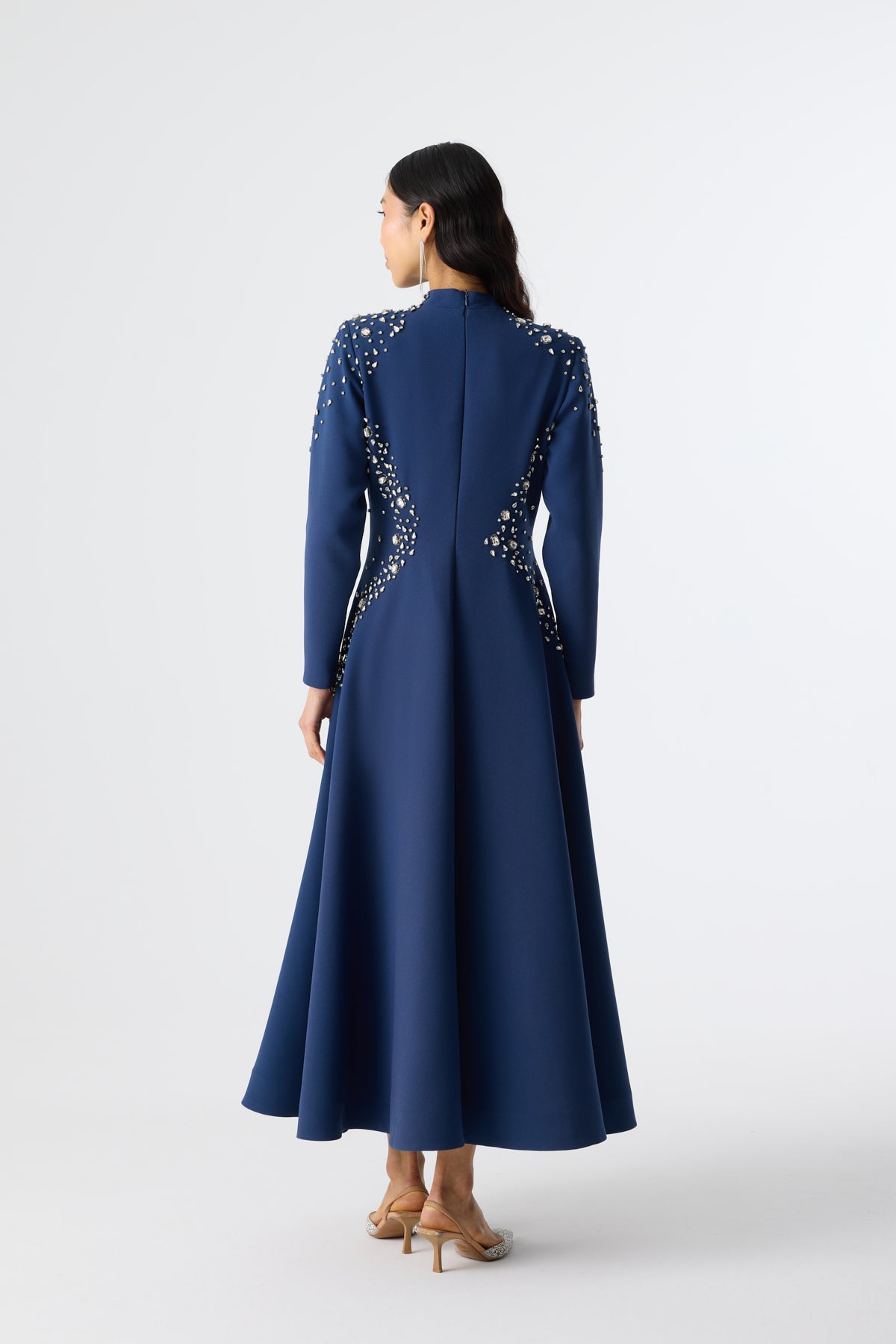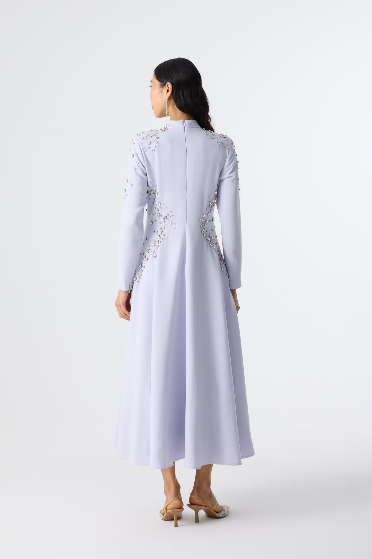 Ürün ortalama 135 cm. Elbisenin arkası fermuarlıdır, astarlıdır. Krep kumaştan hazırlanmıştır. Bel kısmındaki detaylar özel taşlarla özenle el işçiliği ile işlenmiştir.