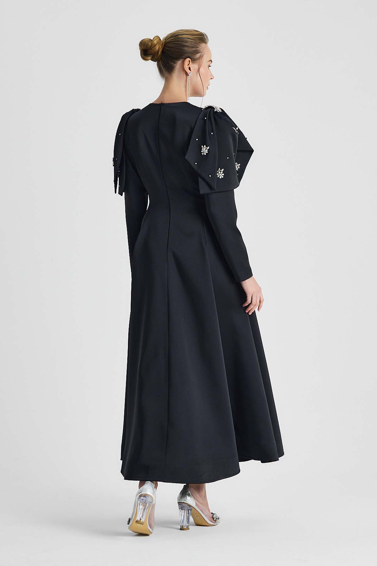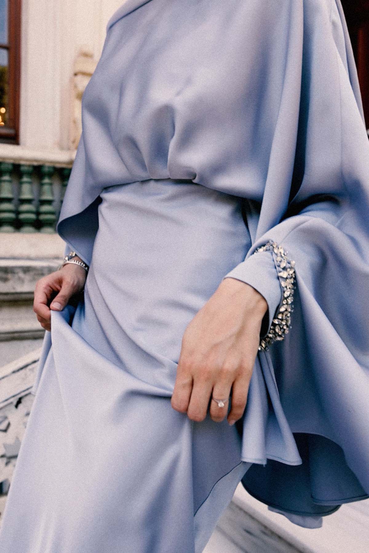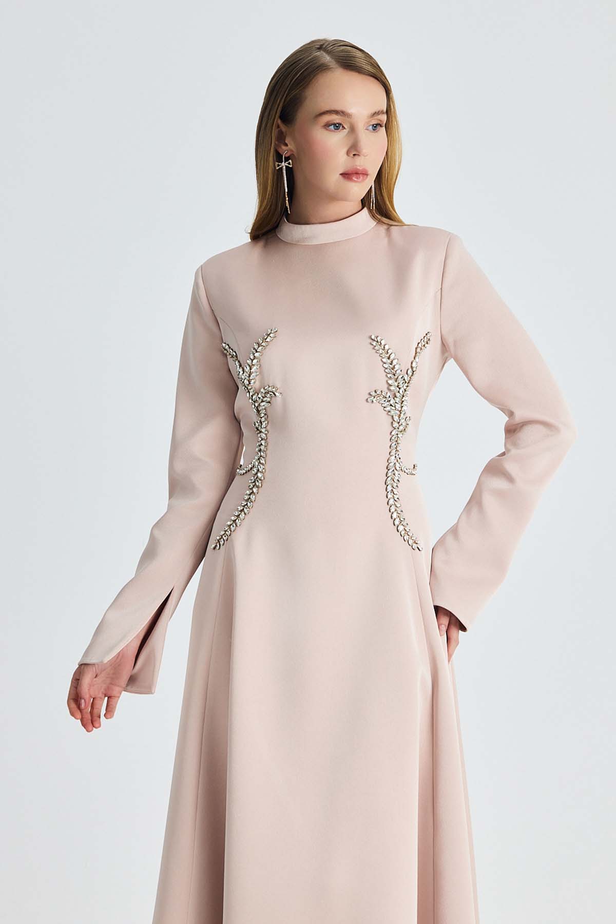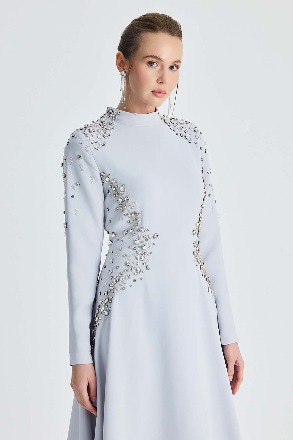 Ürün ortalama 155 cm. Ürünün arkası fermuarlıdır, astarlıdır. Saten krep kumaştan hazırlanmıştır. Kollarında özel taşlarla özenle el işçiliği ile işlenmiş taşlar mevcuttur.