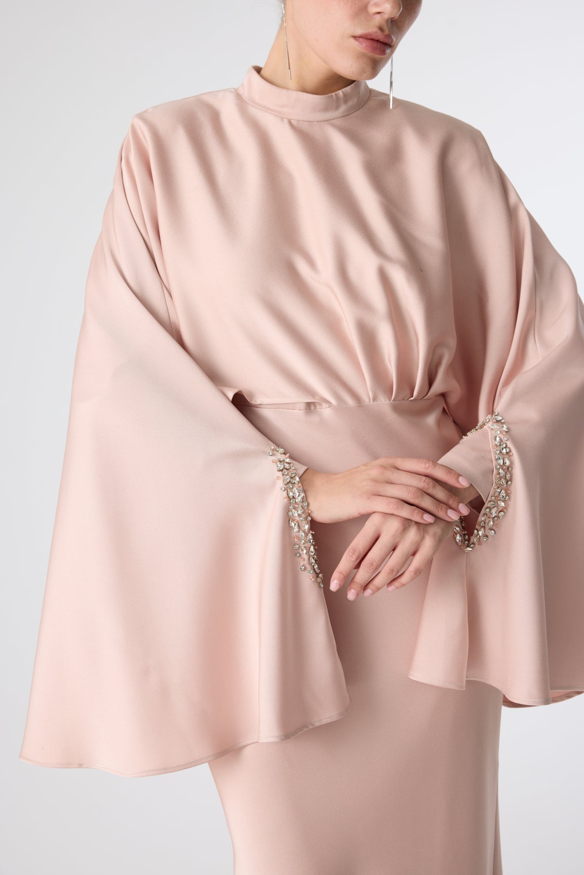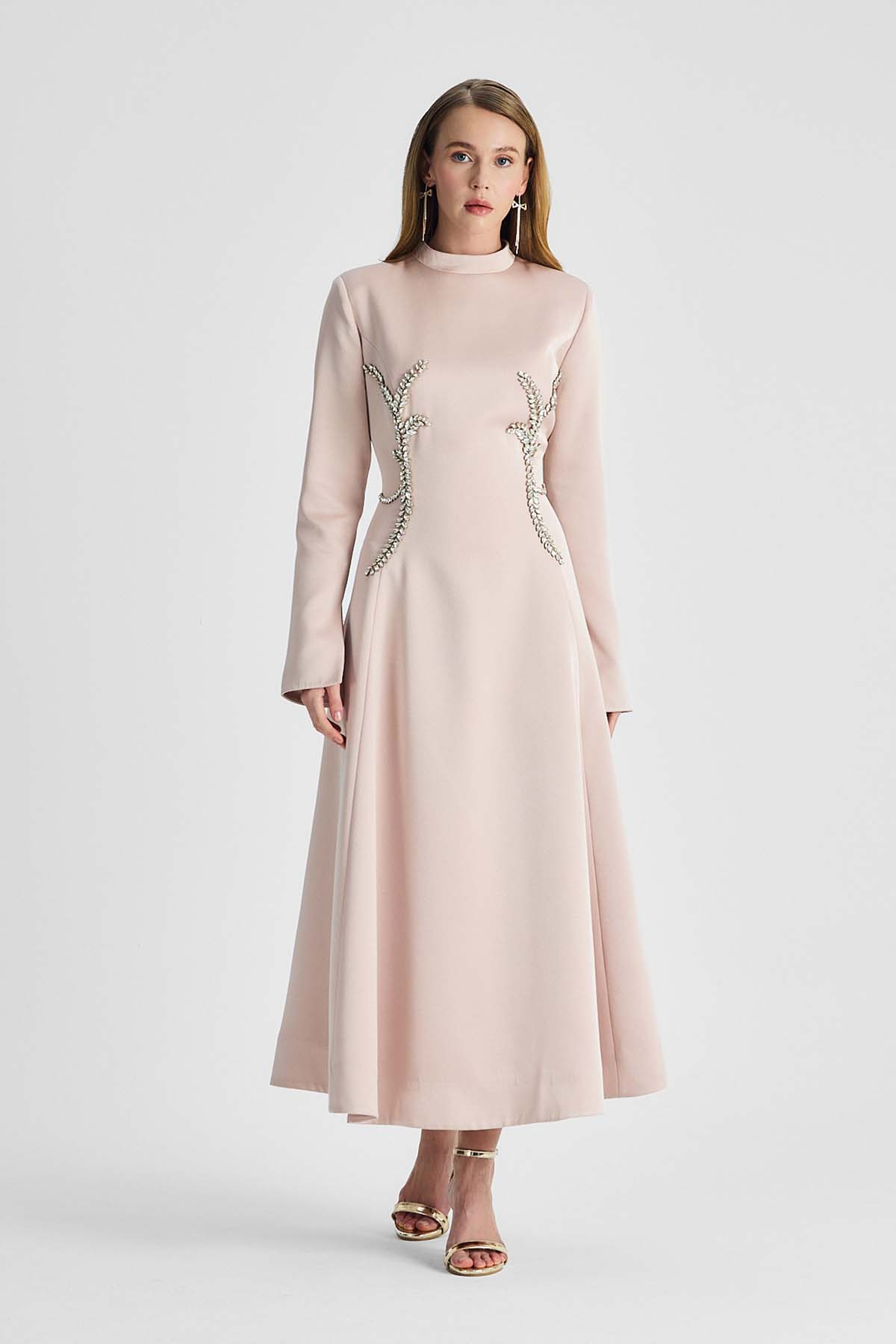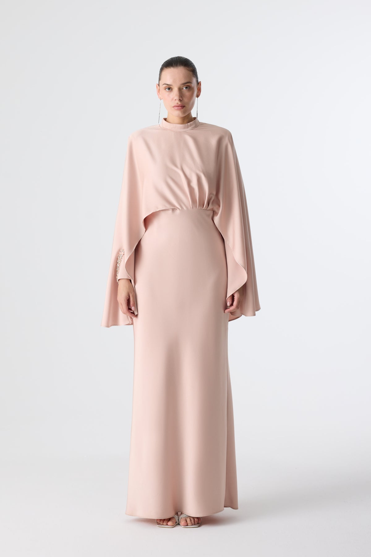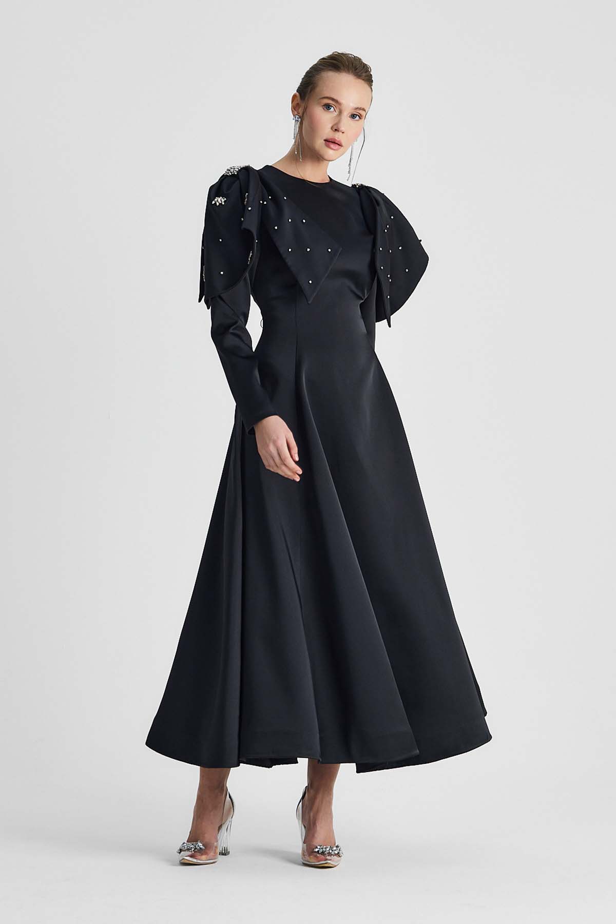 Ürün ortalama 155 cm. Ürünün arkası fermuarlıdır, astarlıdır. Saten krep kumaştan hazırlanmıştır. Kollarında özel taşlarla özenle el işçiliği ile işlenmiş taşlar mevcuttur.