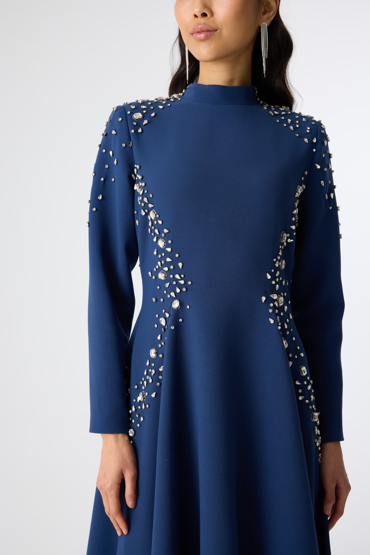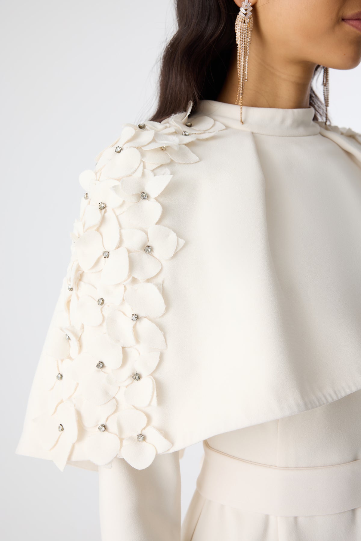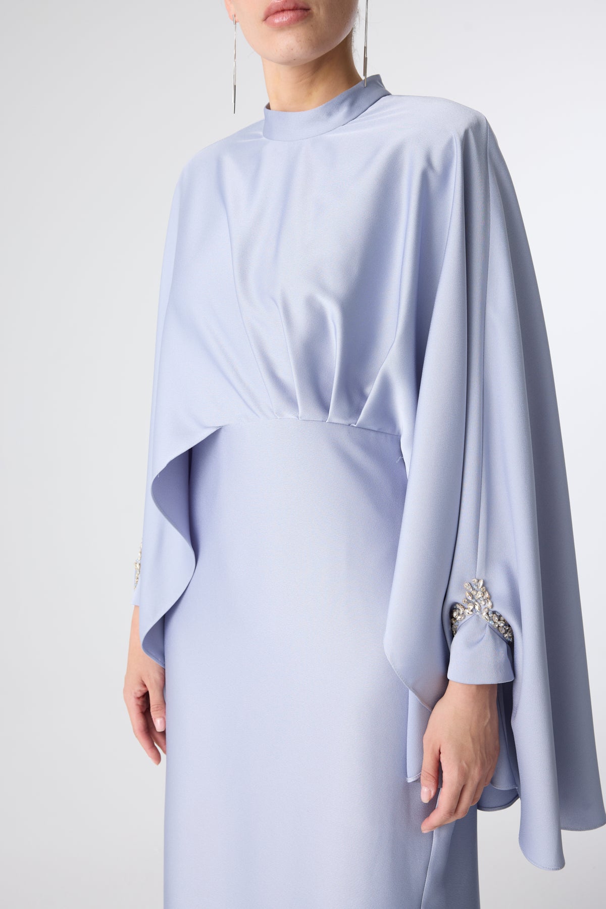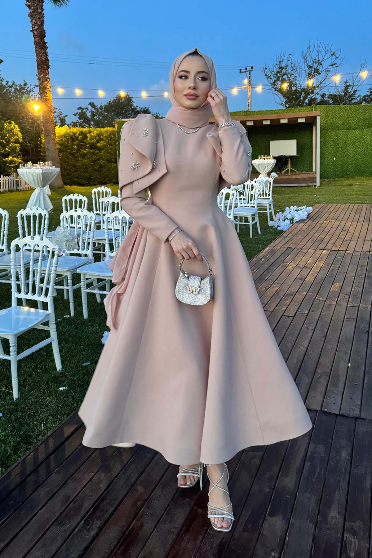 Ürün ortalama 155 cm. Ürünün arkası fermuarlıdır, astarlıdır. Saten krep kumaştan hazırlanmıştır. Kollarında özel taşlarla özenle el işçiliği ile işlenmiş taşlar mevcuttur.