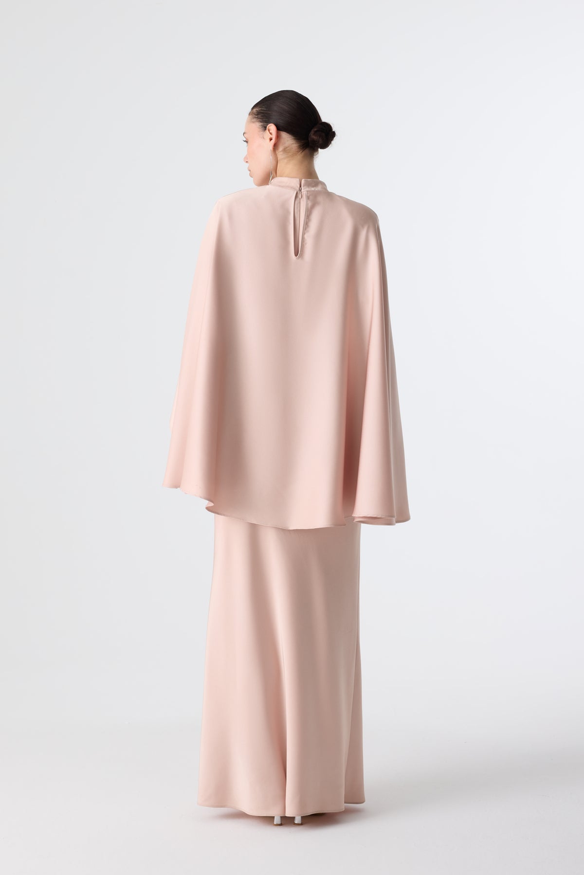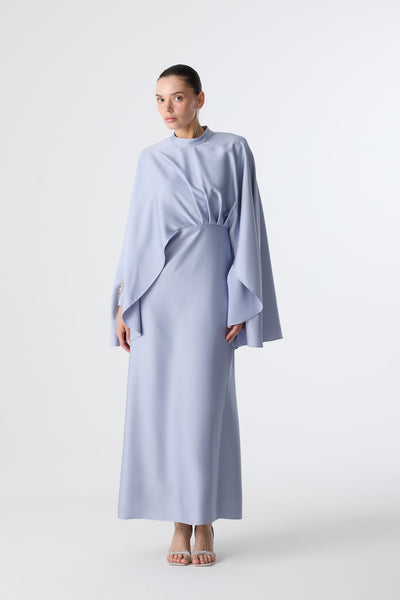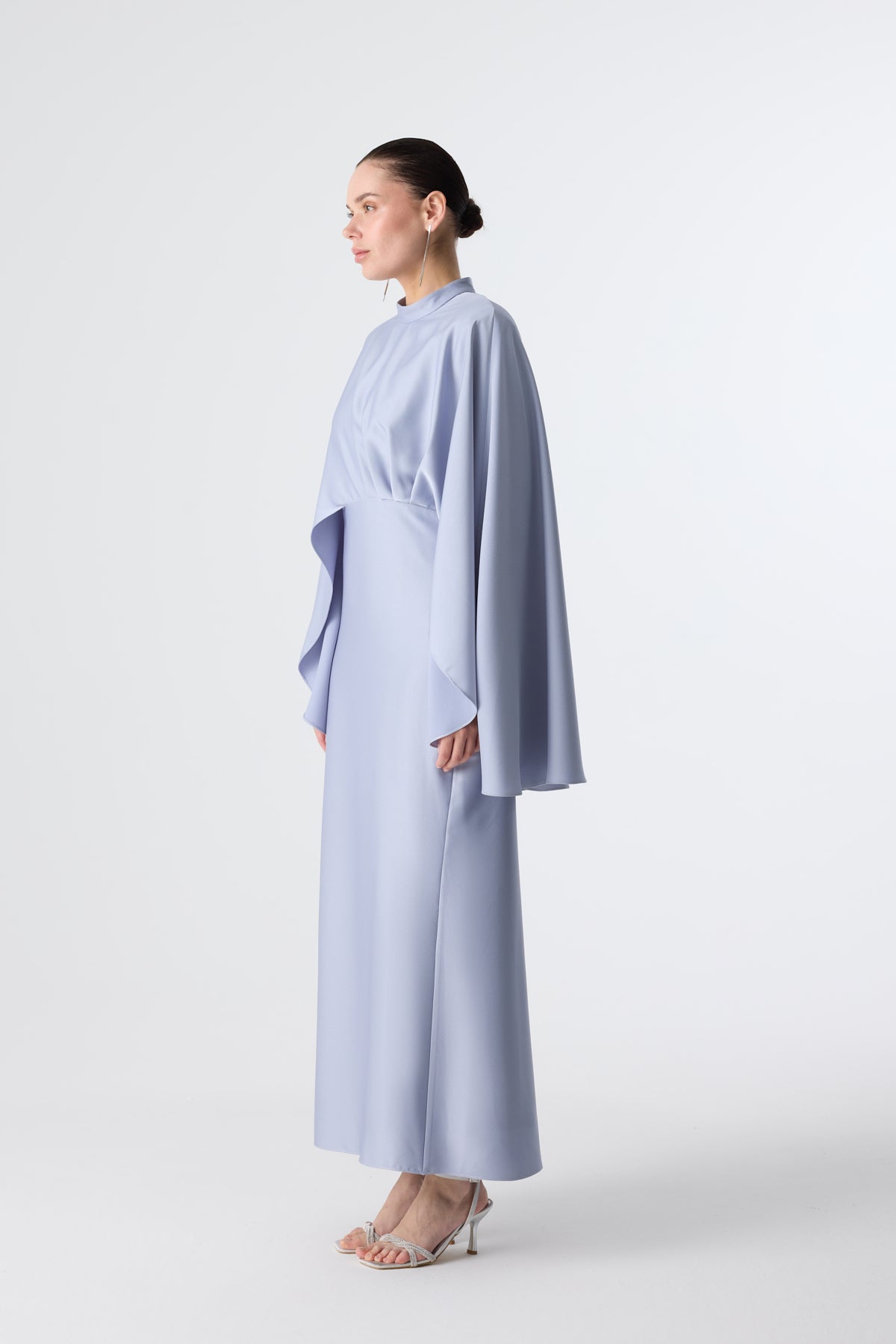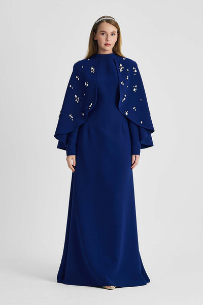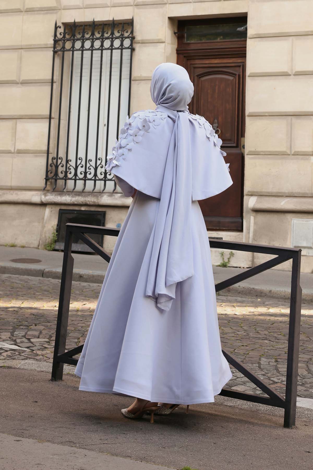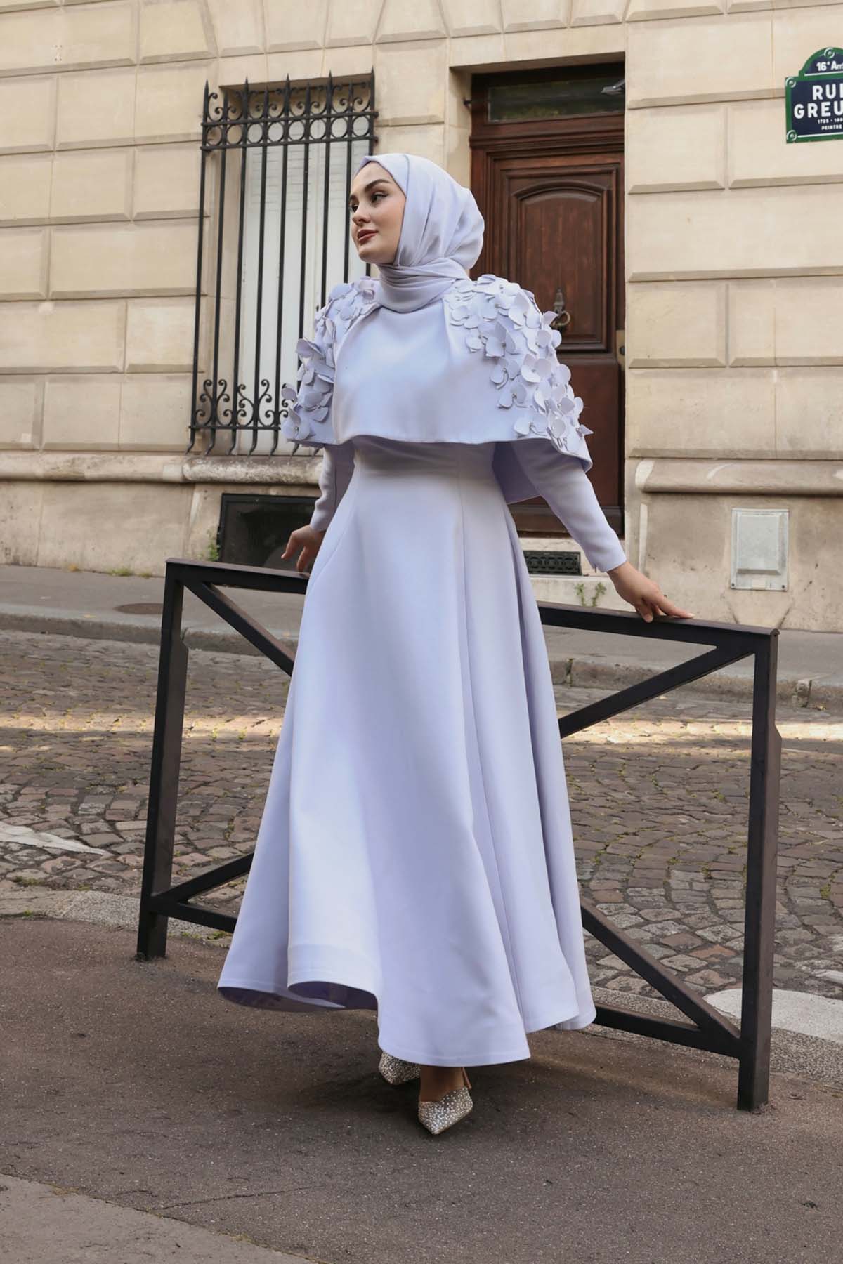 Ürün ortalama 160 cm. Ürünün arkası fermuarlıdır, astarlıdır ve arkası kuyrukludur. Özel üretilmiş ipek kumaş ile hazırlanmıştır. Kolları kısa manşetlidir. Omuz kısmında yere doğru uzanan pelerin mevcuttur. Kloş kesimdir.