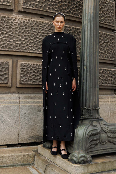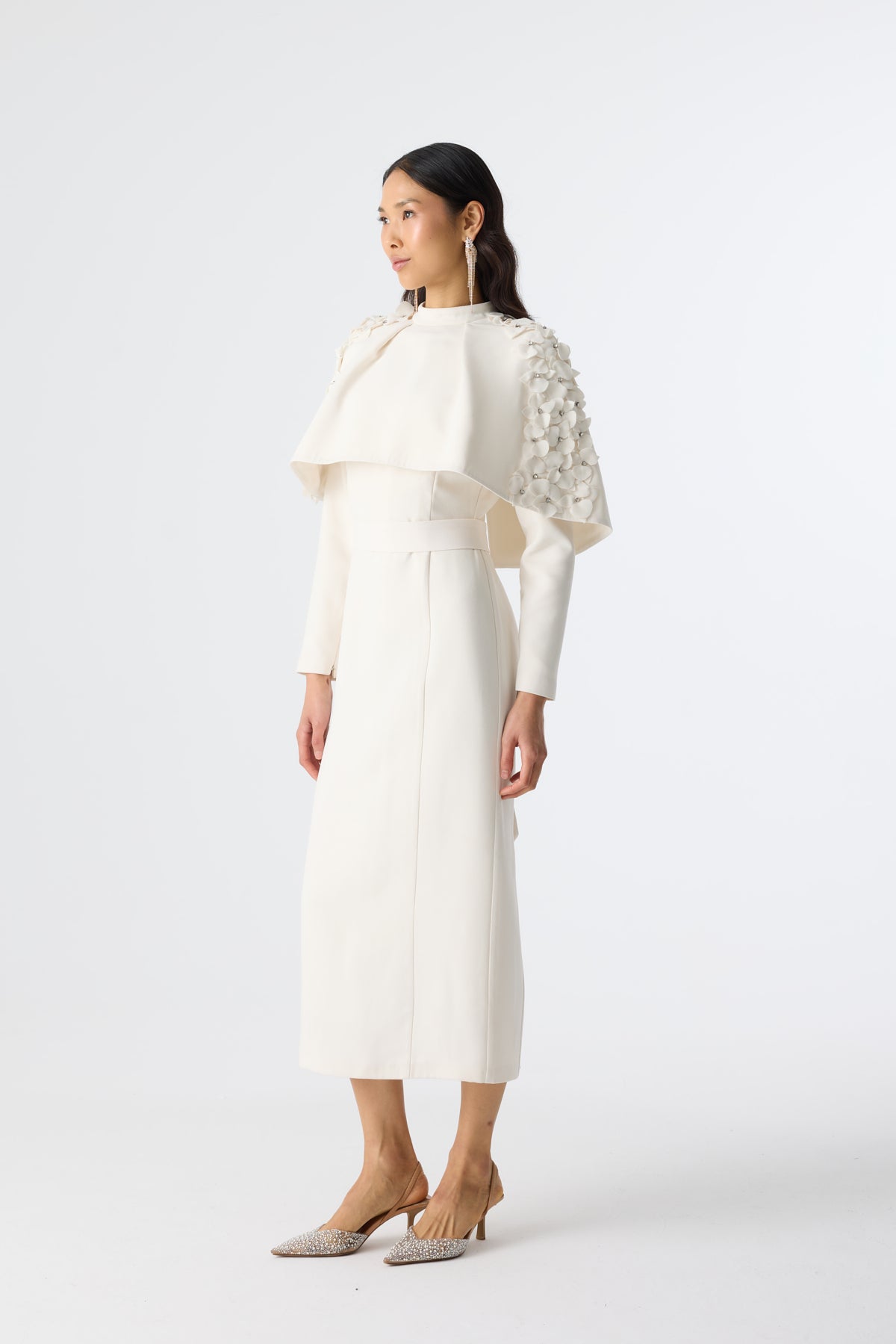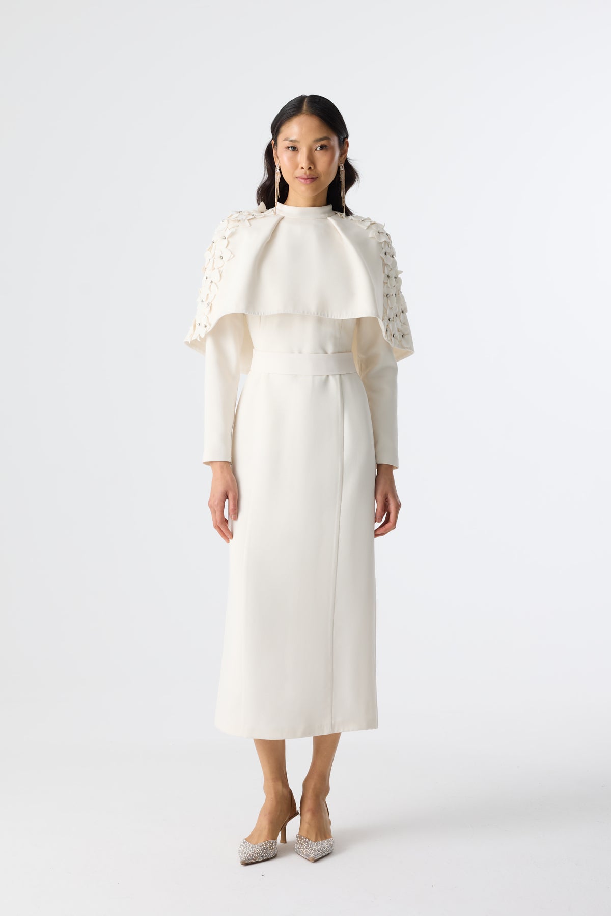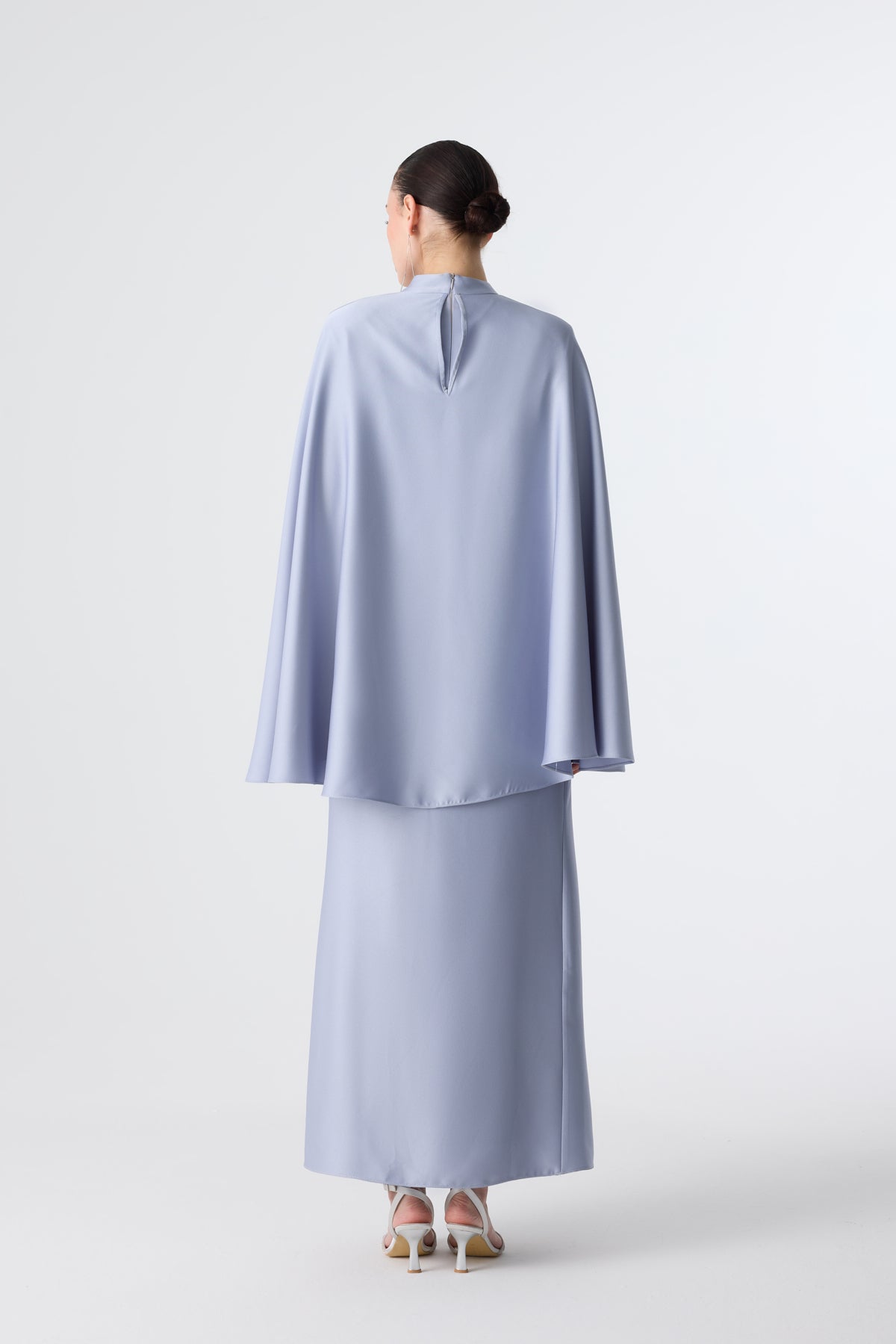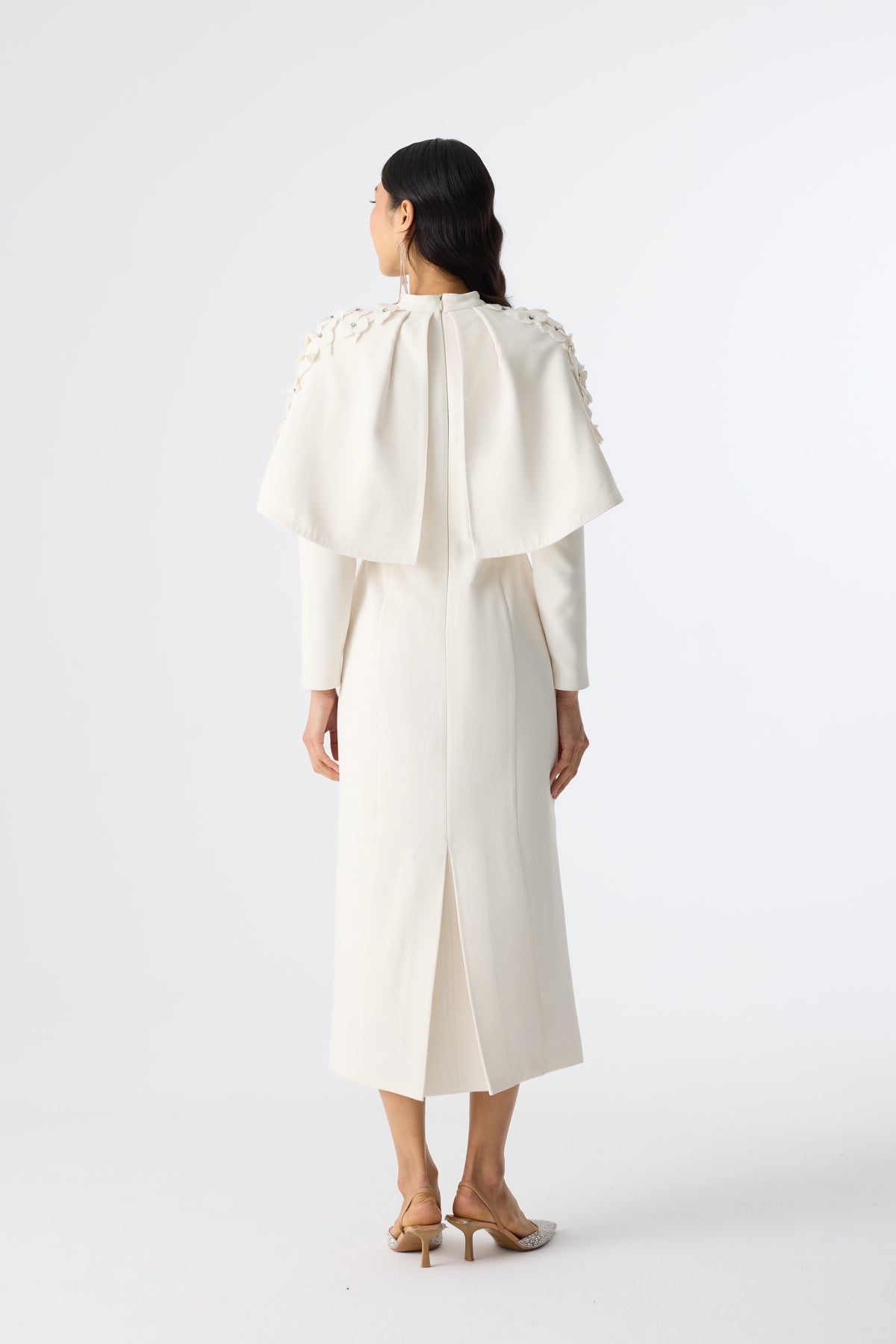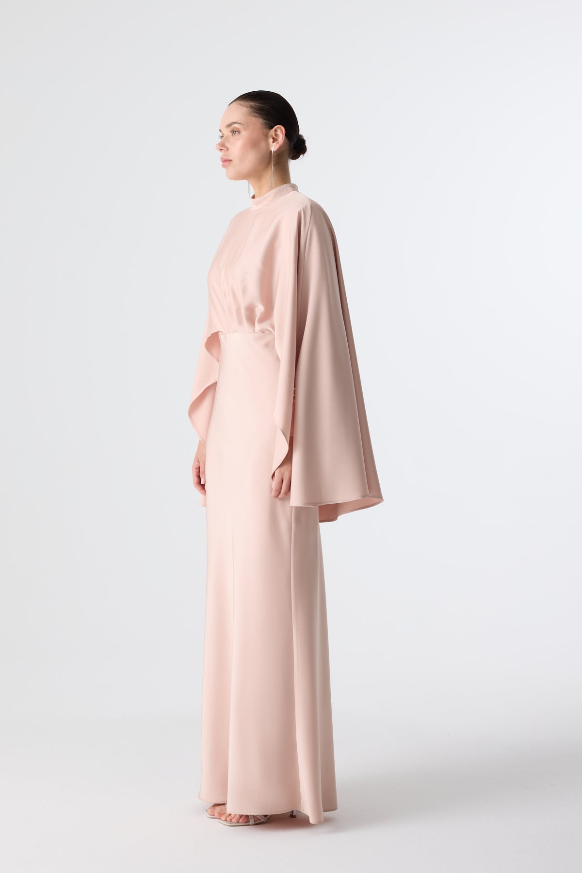 Ürün ortalama 160 cm. Ürünün arkası fermuarlıdır, astarlıdır ve arkası kuyrukludur. Özel üretilmiş ipek kumaş ile hazırlanmıştır. Kolları kısa manşetlidir. Omuz kısmında yere doğru uzanan pelerin mevcuttur. Kloş kesimdir.
