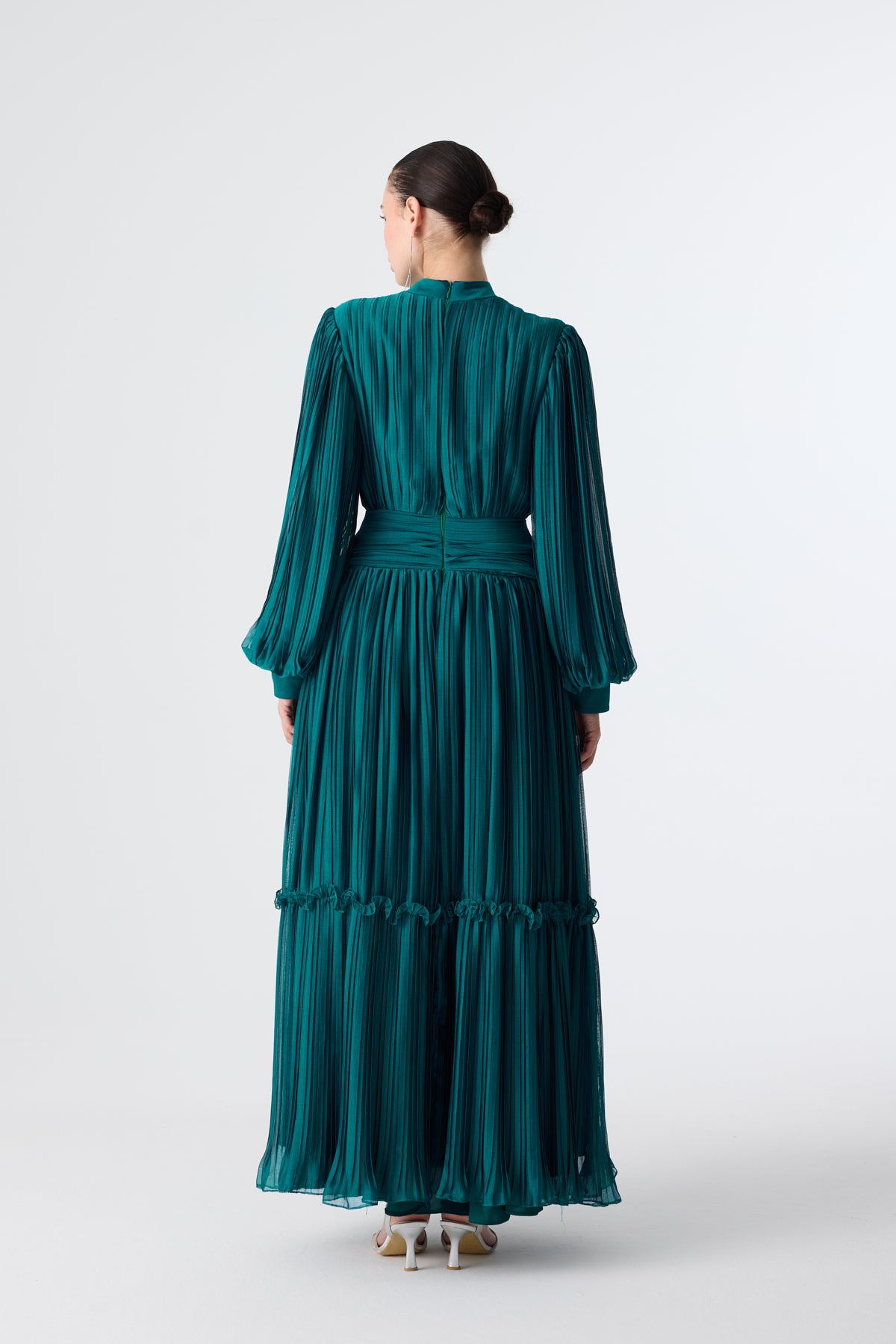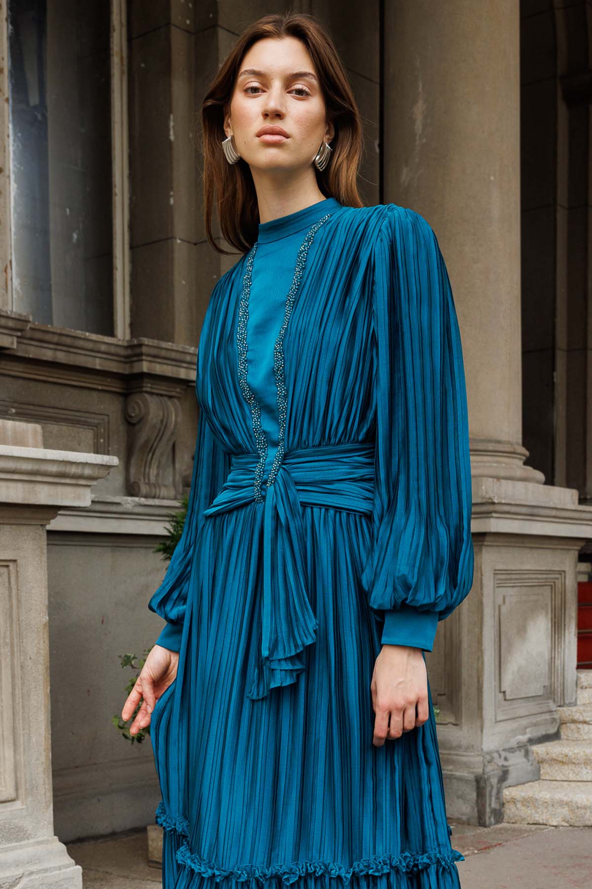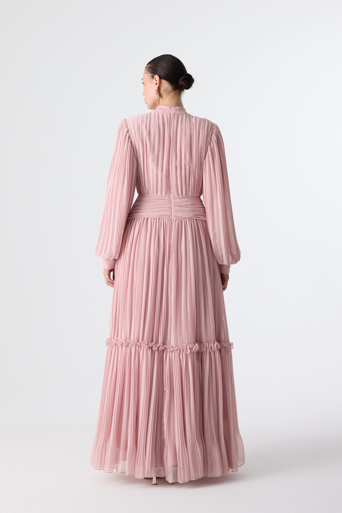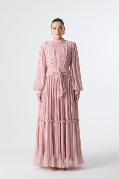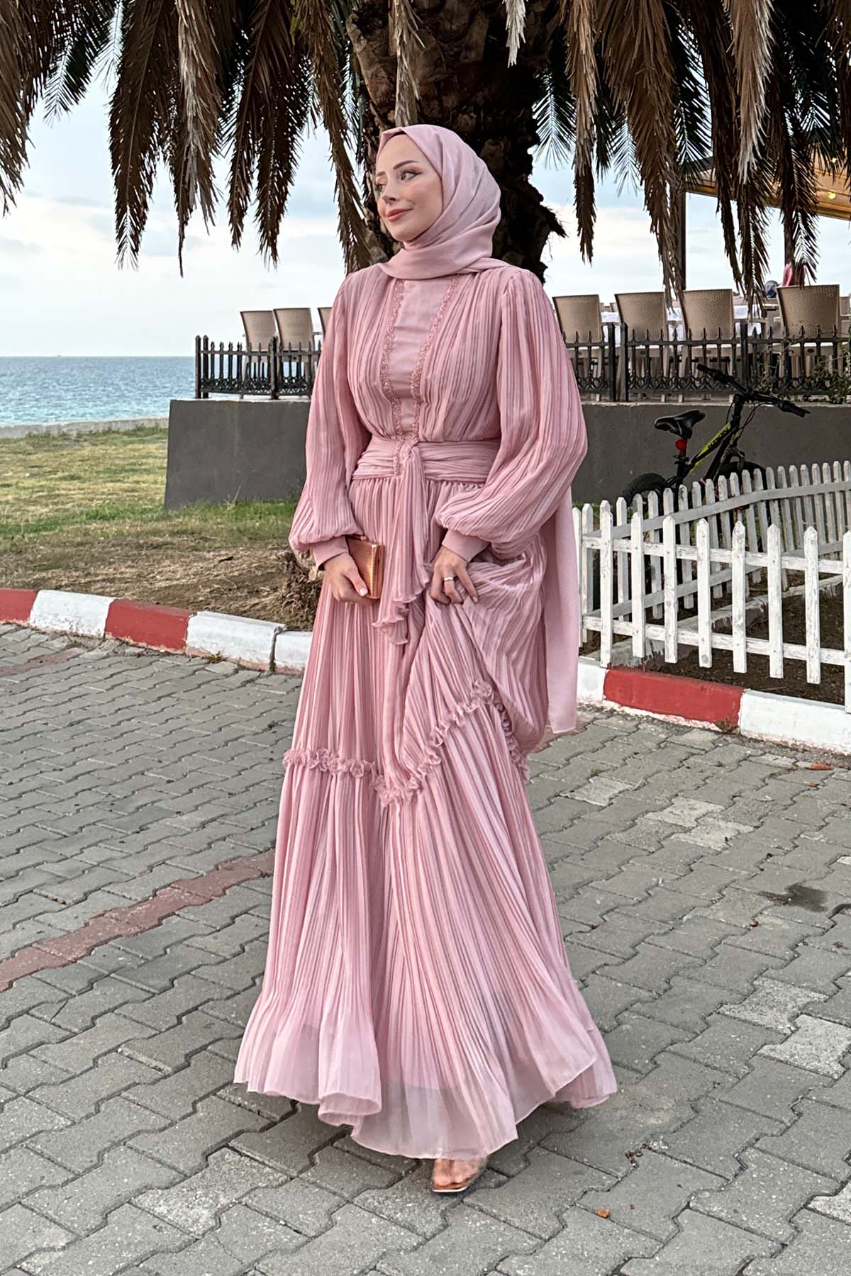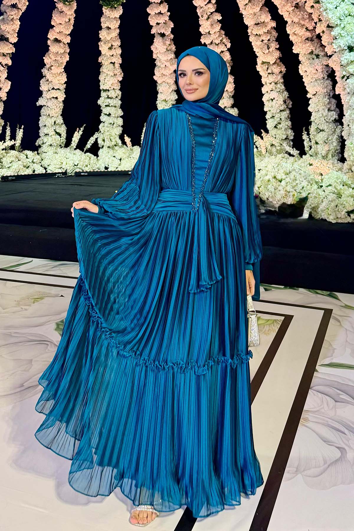 Ürün ortalama 150 cm. Ürünün arkası fermuarlıdır, astarlıdır. Şifon kumaşa pilise işlem uygulanmıştır. İşleme detayları el işçiliği ile tamamlanmıştır.