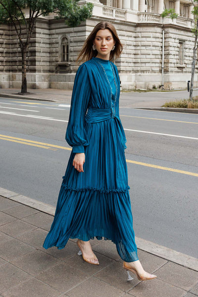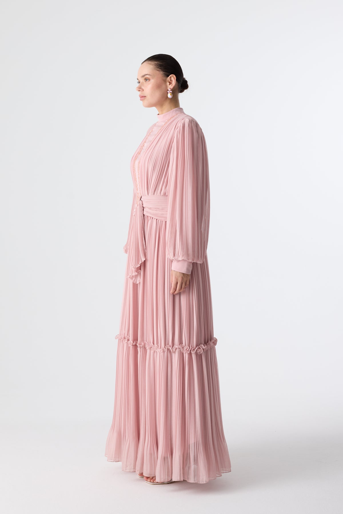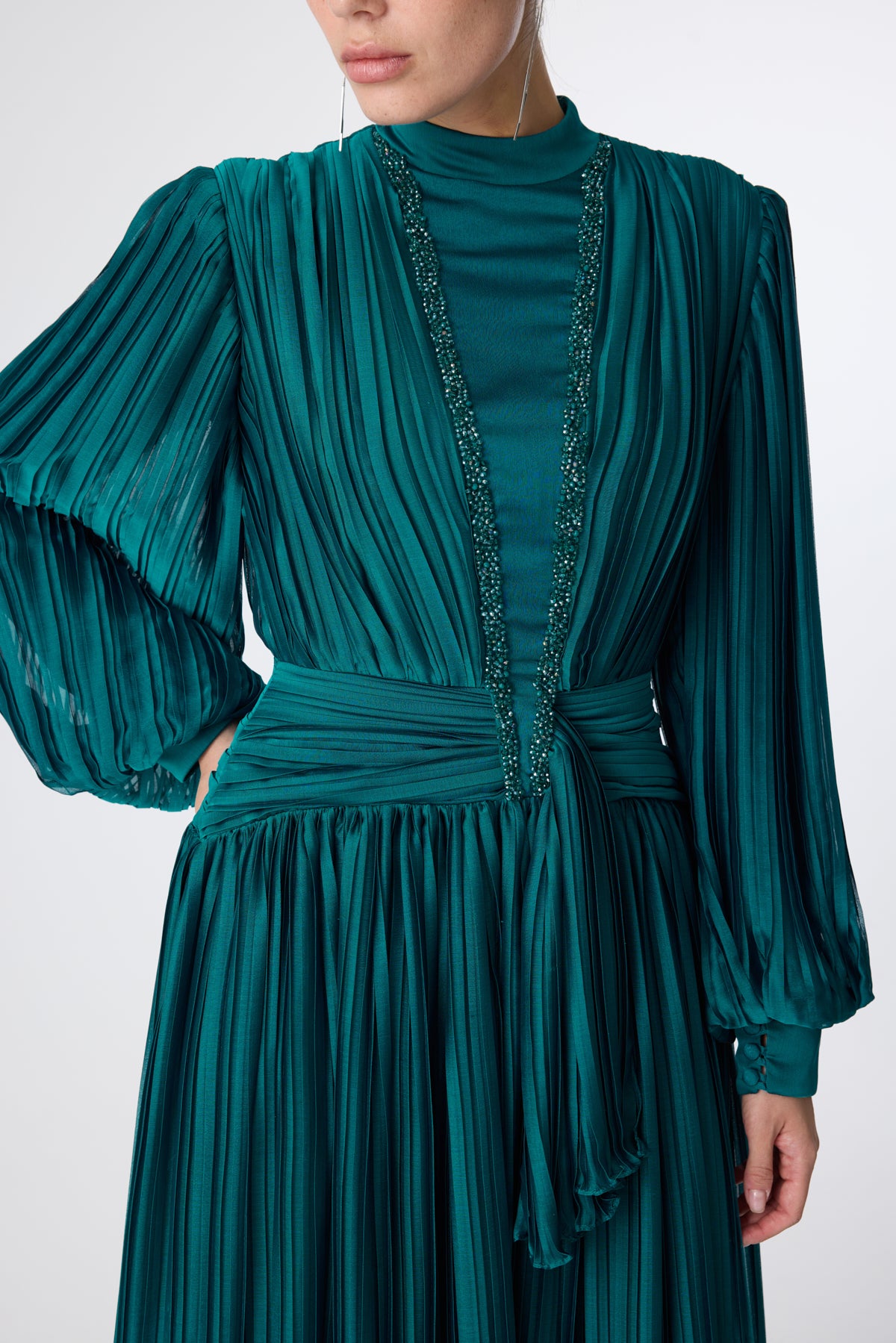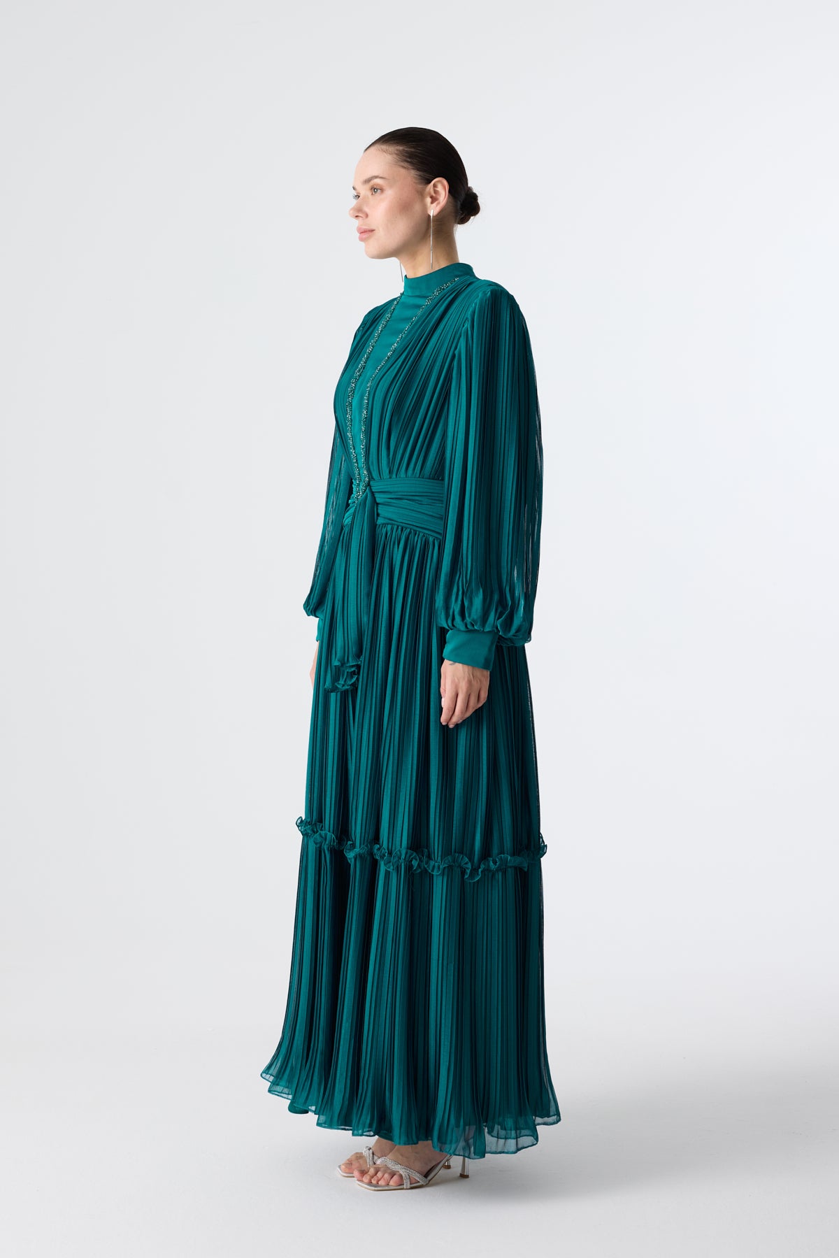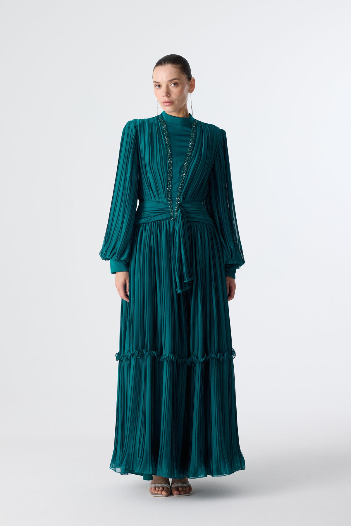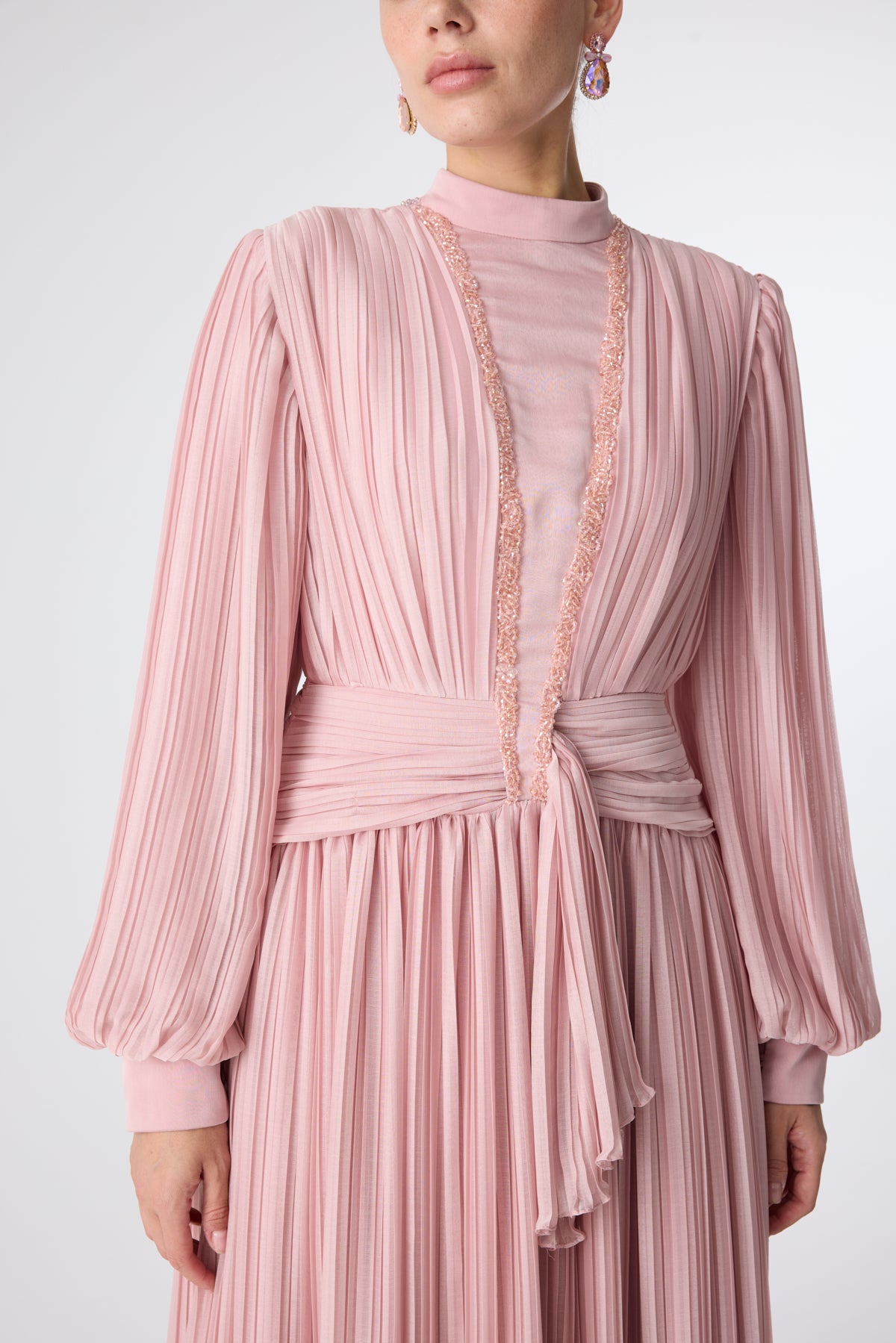 Ürün ortalama 150 cm. Ürünün arkası fermuarlıdır, astarlıdır. Şifon kumaşa pilise işlem uygulanmıştır. İşleme detayları el işçiliği ile tamamlanmıştır.