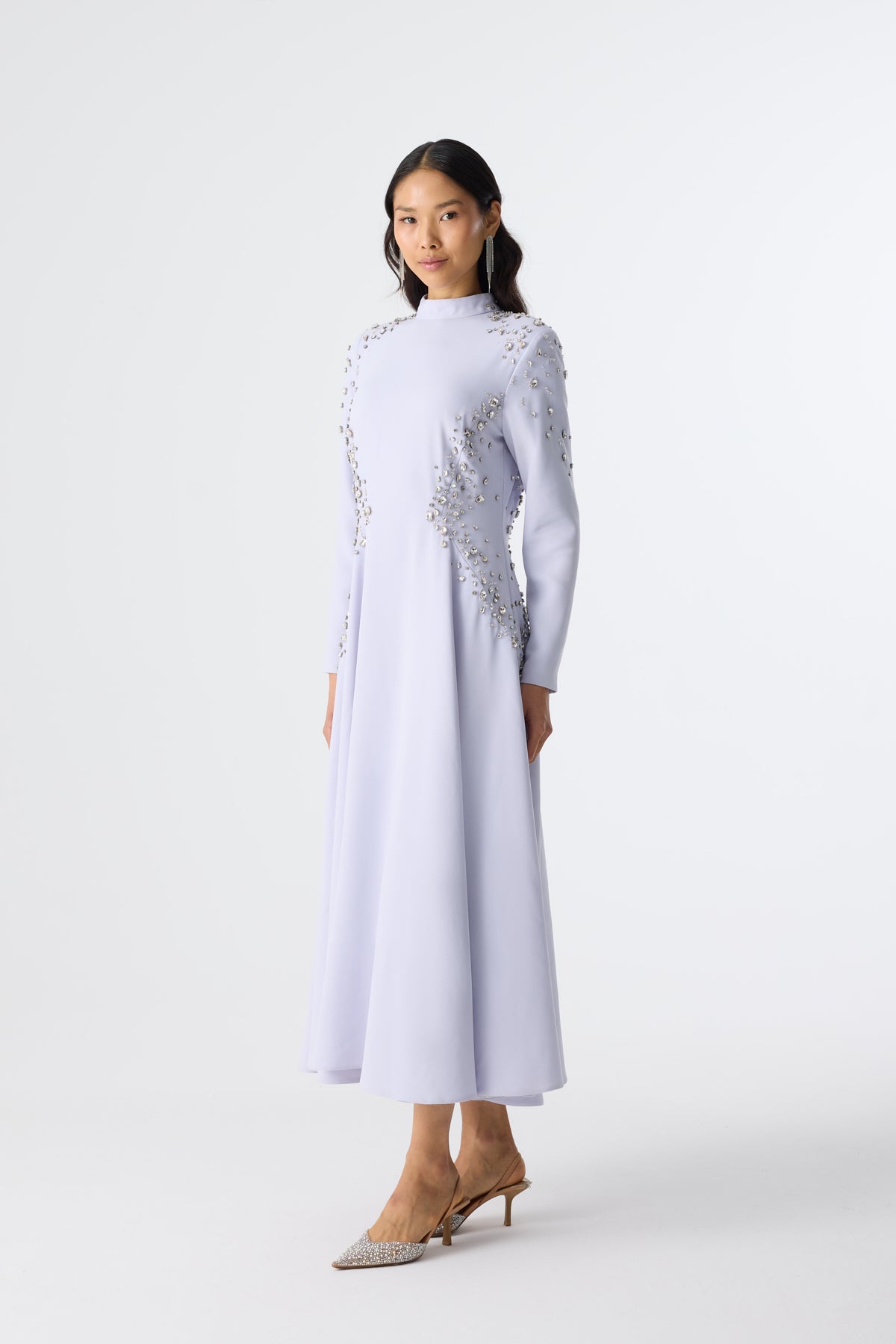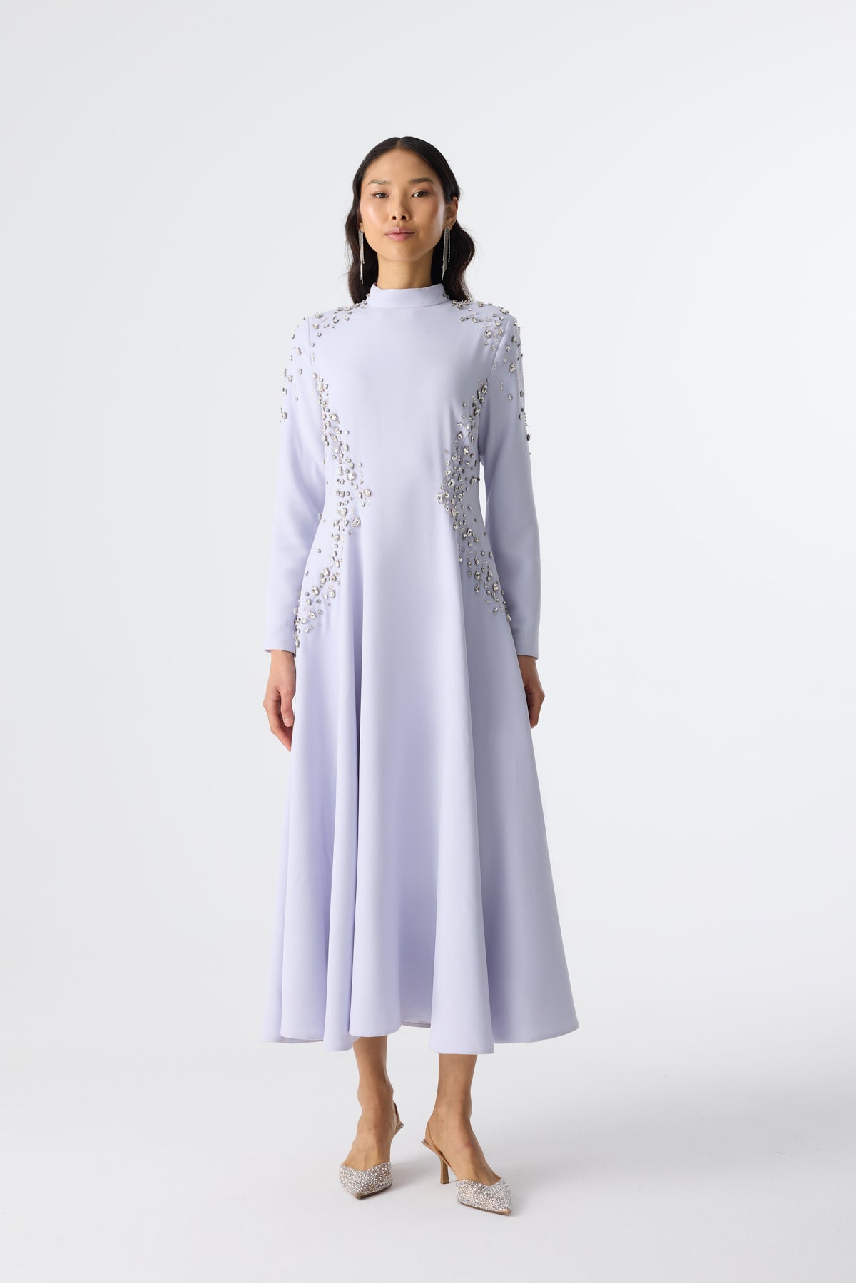 Ürün ortalama 138 cm. Elbisenin arkası fermuarlıdır, astarlıdır. Etek kısmı kloş kesimdir. Krep kumaştan hazırlanmıştır. Özel taşlarla özenle el işçiliği ile işlenmiştir.