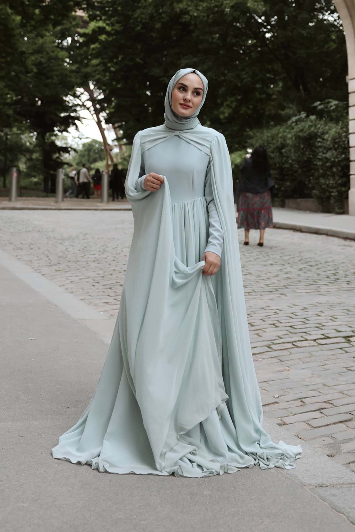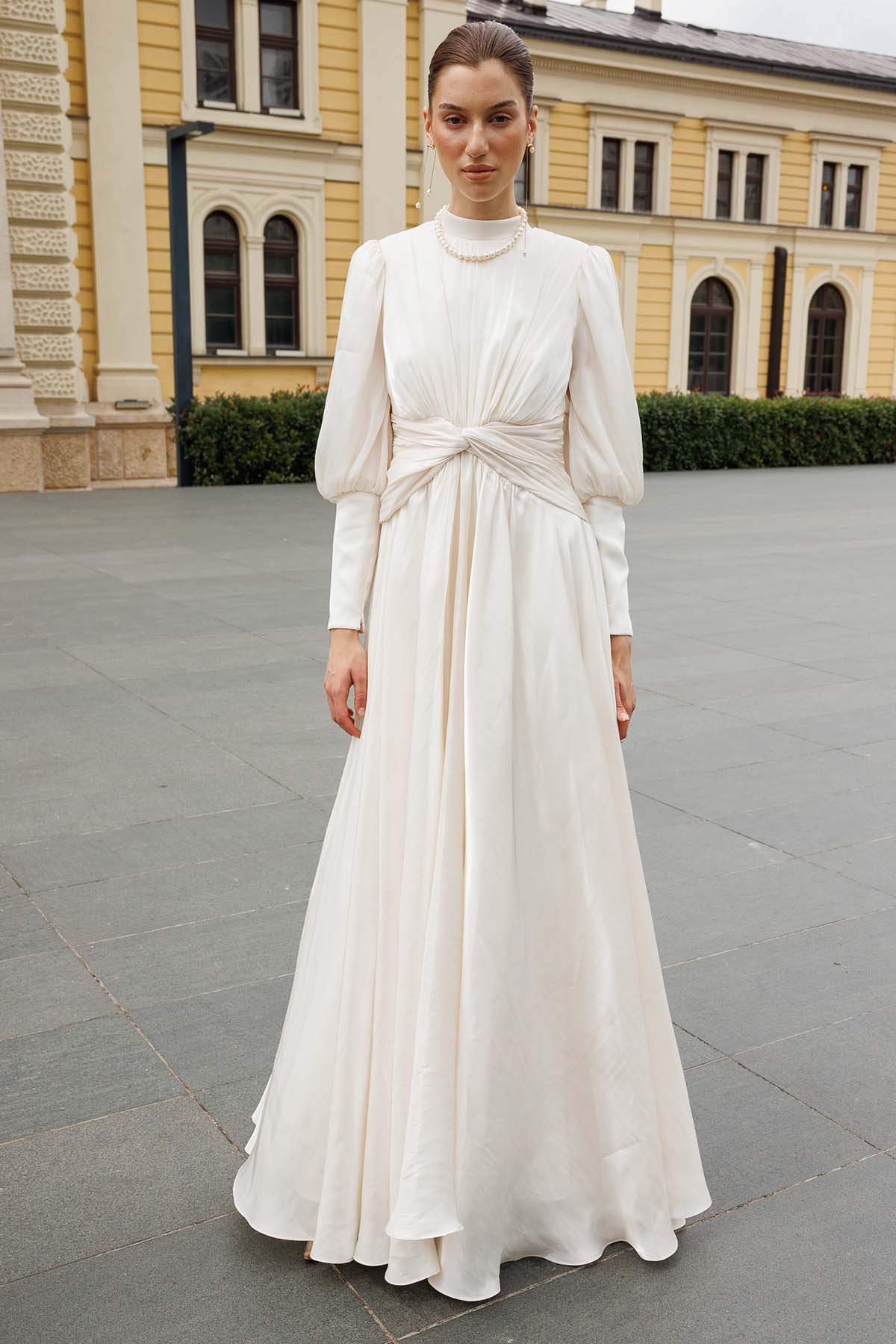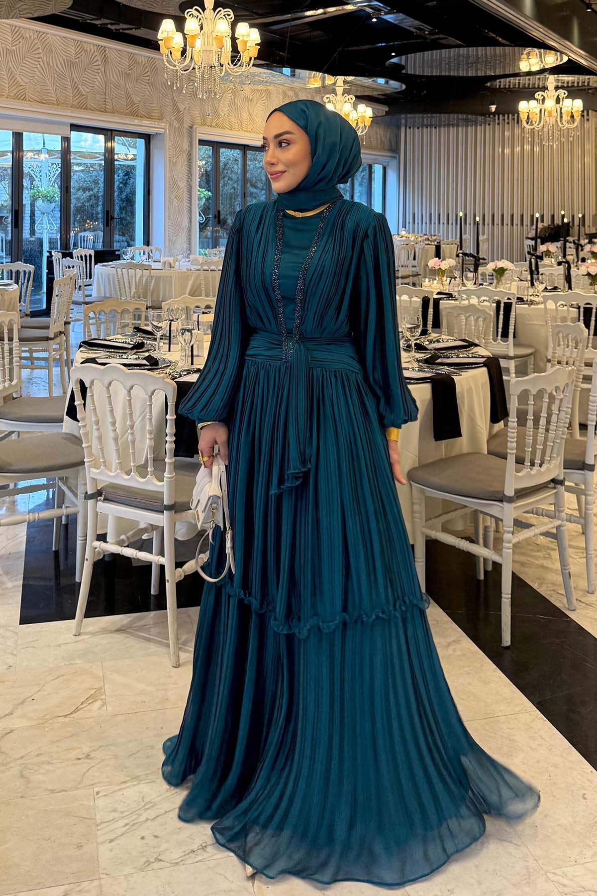 Ürün ortalama 155 cm. Ürünün arkası fermuarlıdır, astarlıdır. Özel üretilmiş ipek kumaş ile hazırlanmıştır. Kolları uzun manşetlidir. Kloş kesimdir.