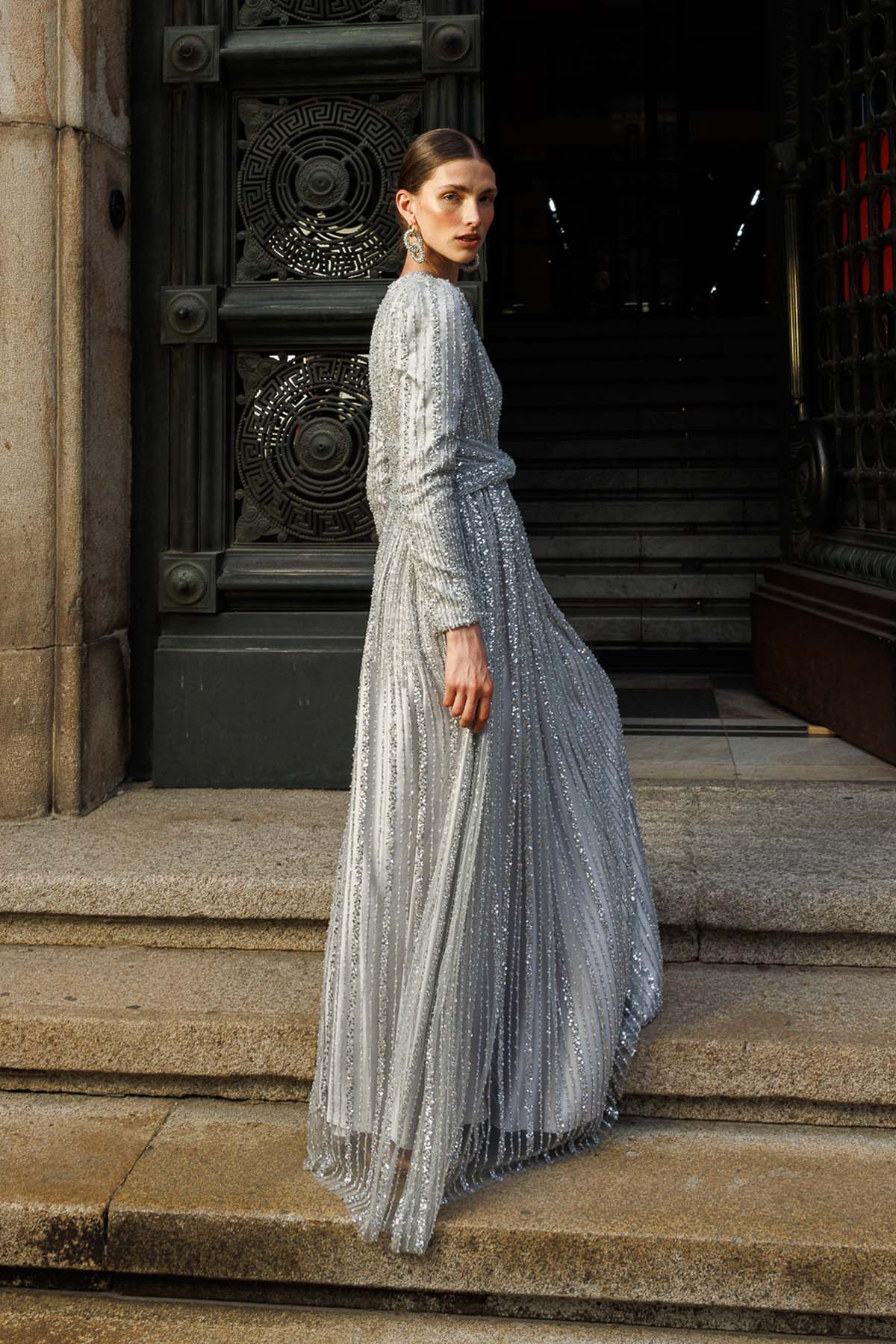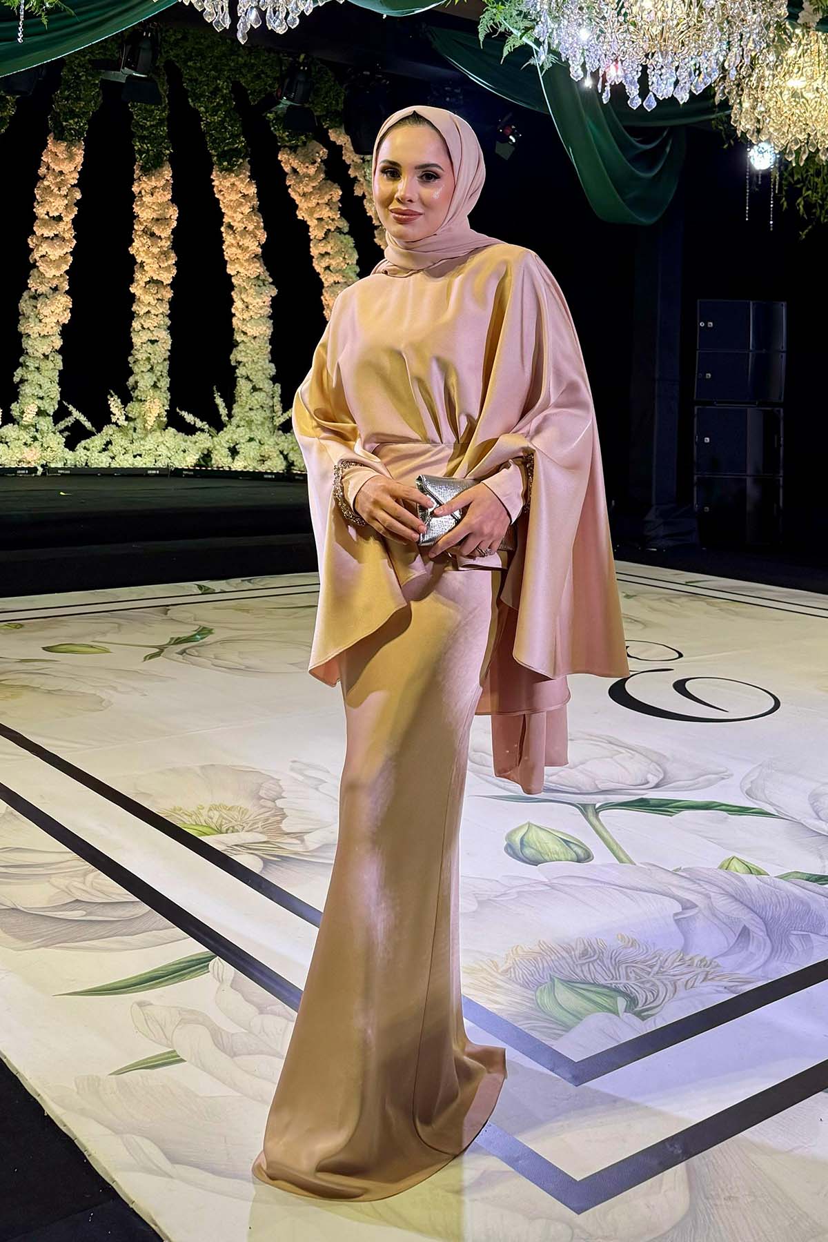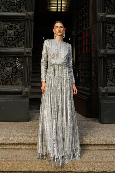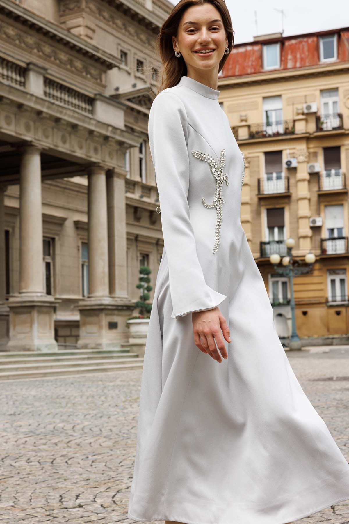 Ürün ortalama 155 cm. Ürünün arkası fermuarlıdır, astarlıdır. Özel üretilmiş ipek kumaş ile hazırlanmıştır. Kolları uzun manşetlidir. Kloş kesimdir.
