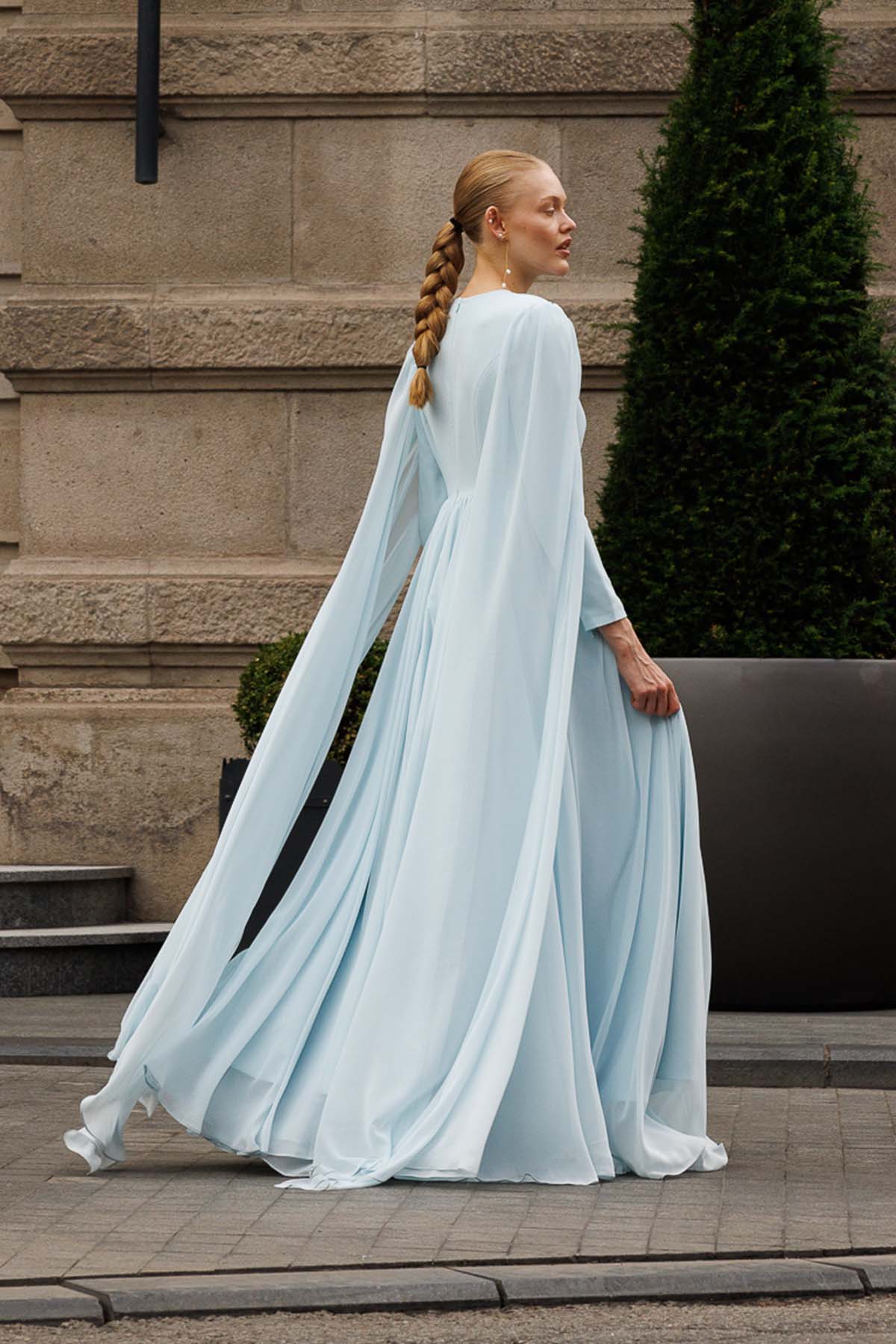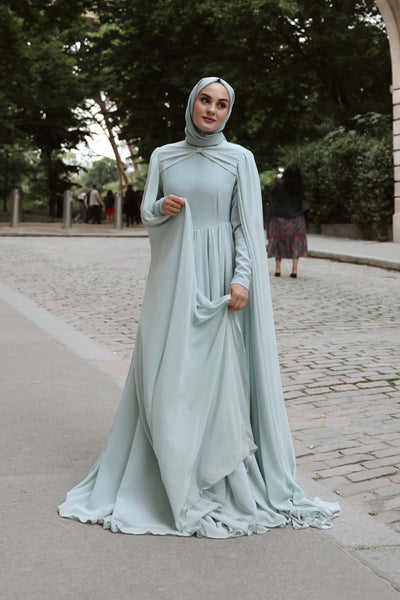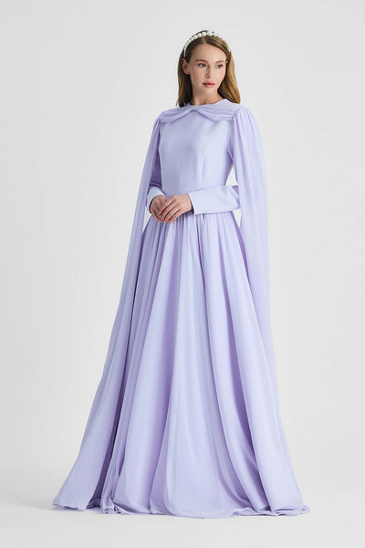 Ürün ortalama 160 cm. Elbisenin arkası fermuarlıdır, astarlıdır. Elbise üst bedeni krep kumaş alt bedeni şifon kumaştan hazırlanmıştır. Kloş etek formundadır. İki omuzdan eteğe doğru uzanan şifon parça bulunmaktadır.
