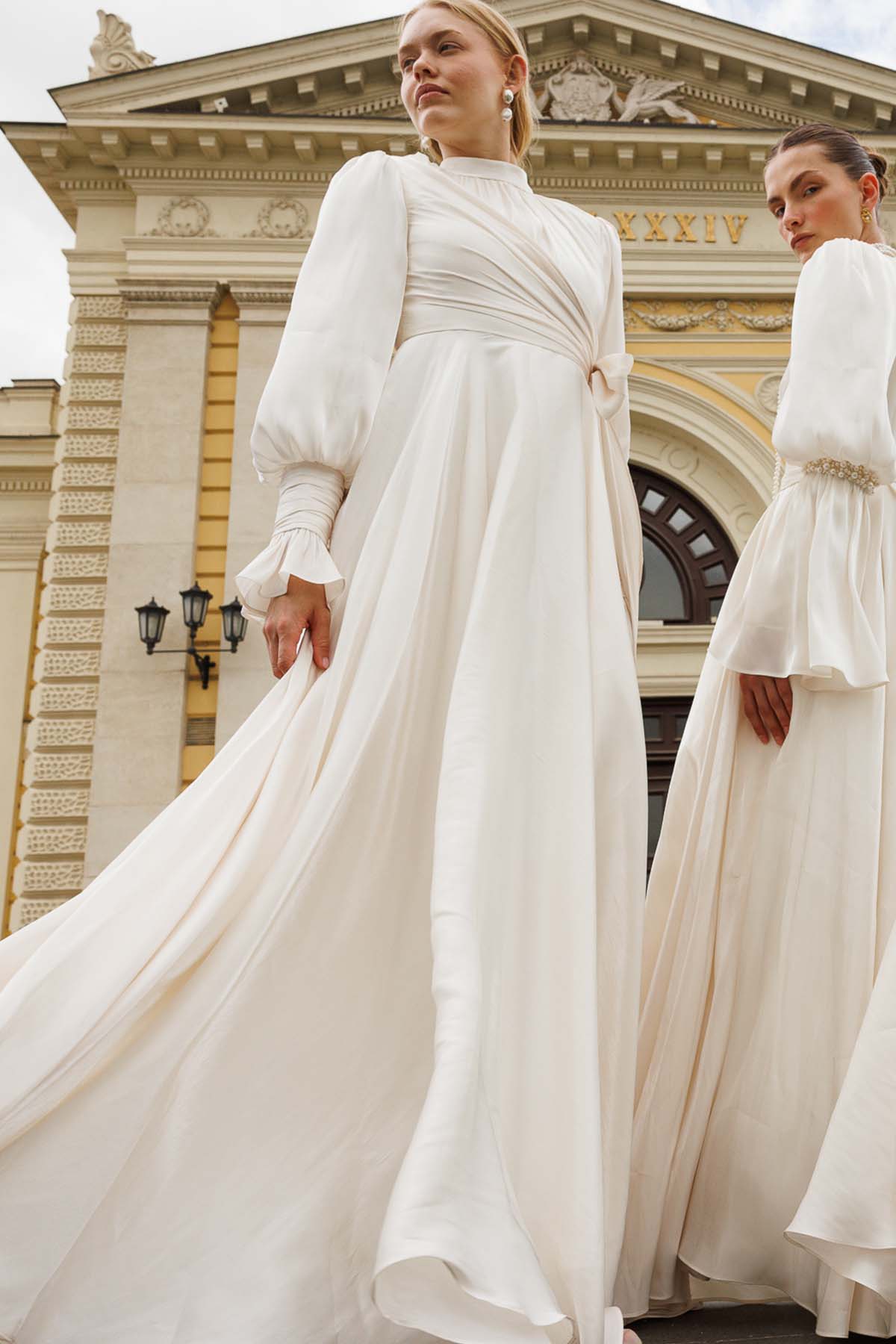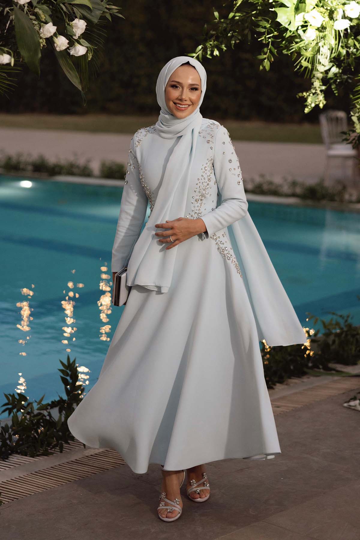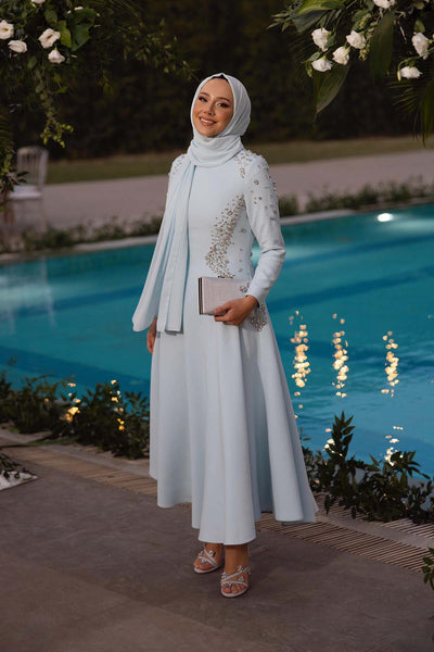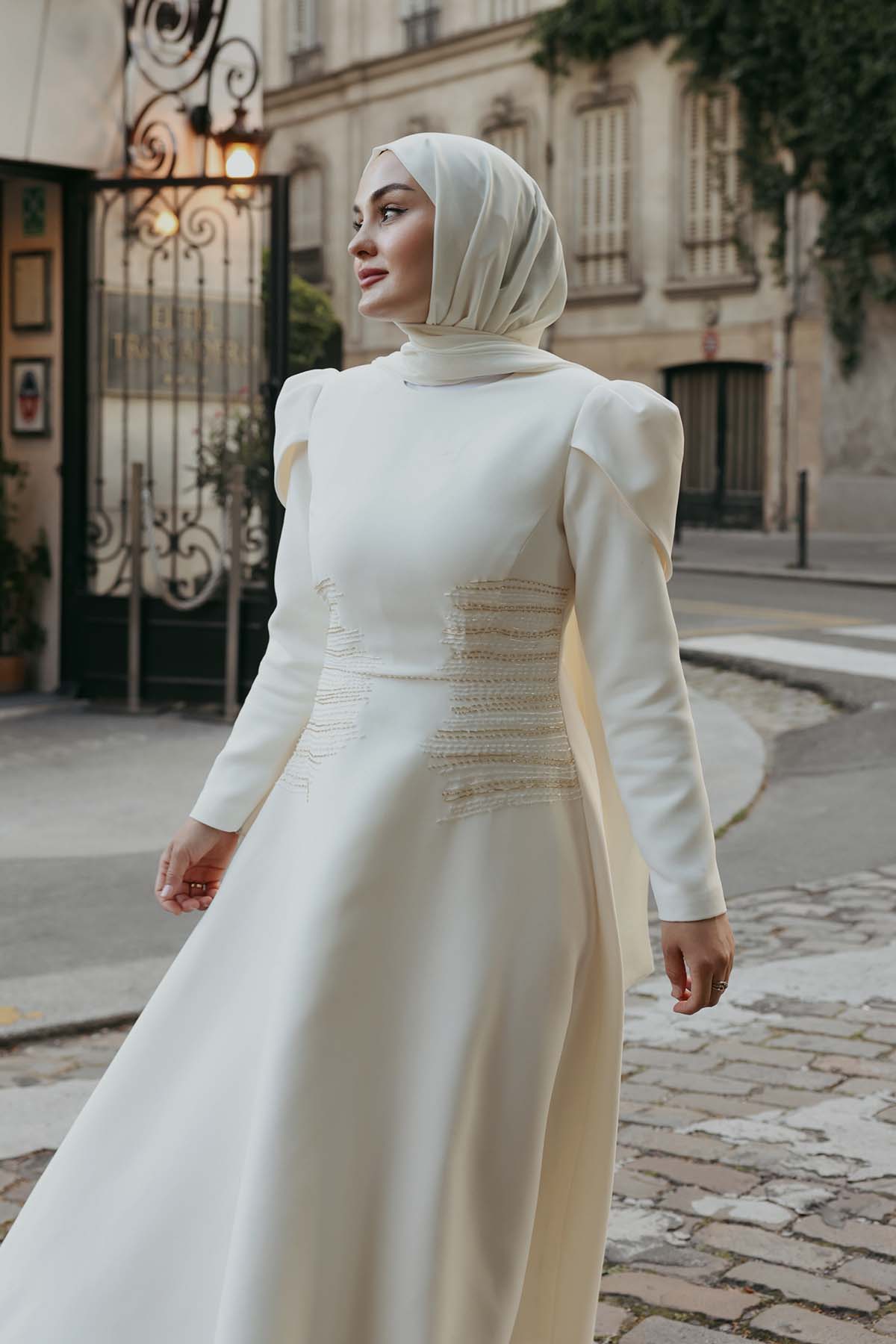 Ürün ortalama 155 cm. Ürünün arkası fermuarlıdır, astarlıdır. Özel üretilmiş ipek kumaş ile hazırlanmıştır. Kollarında volanlıdır. İnci işlemeleri mevcuttur. Kloş kesimdir.