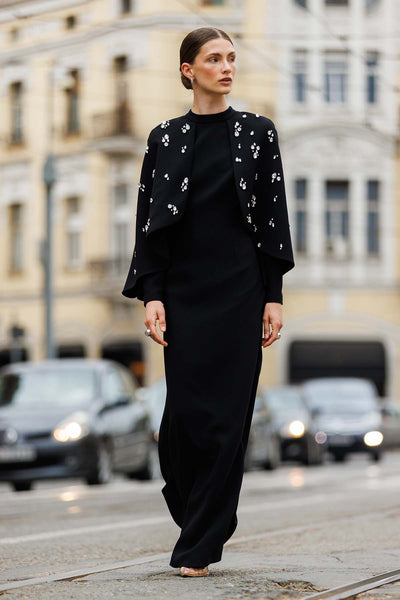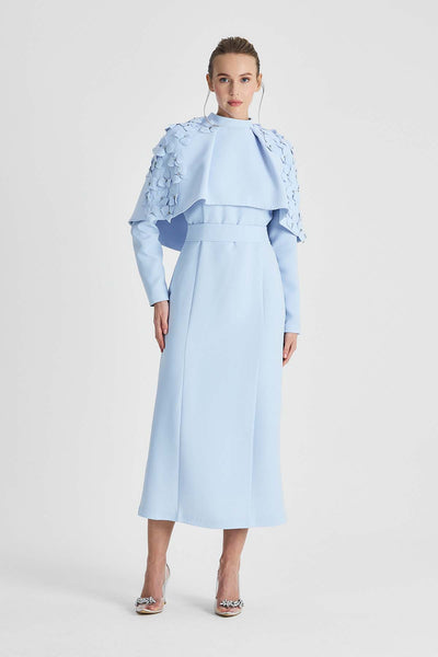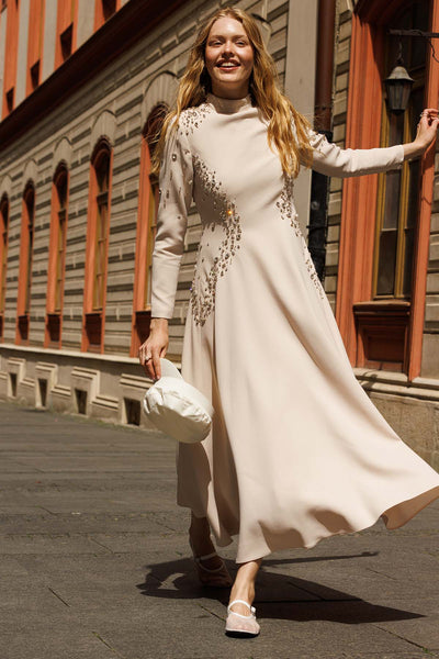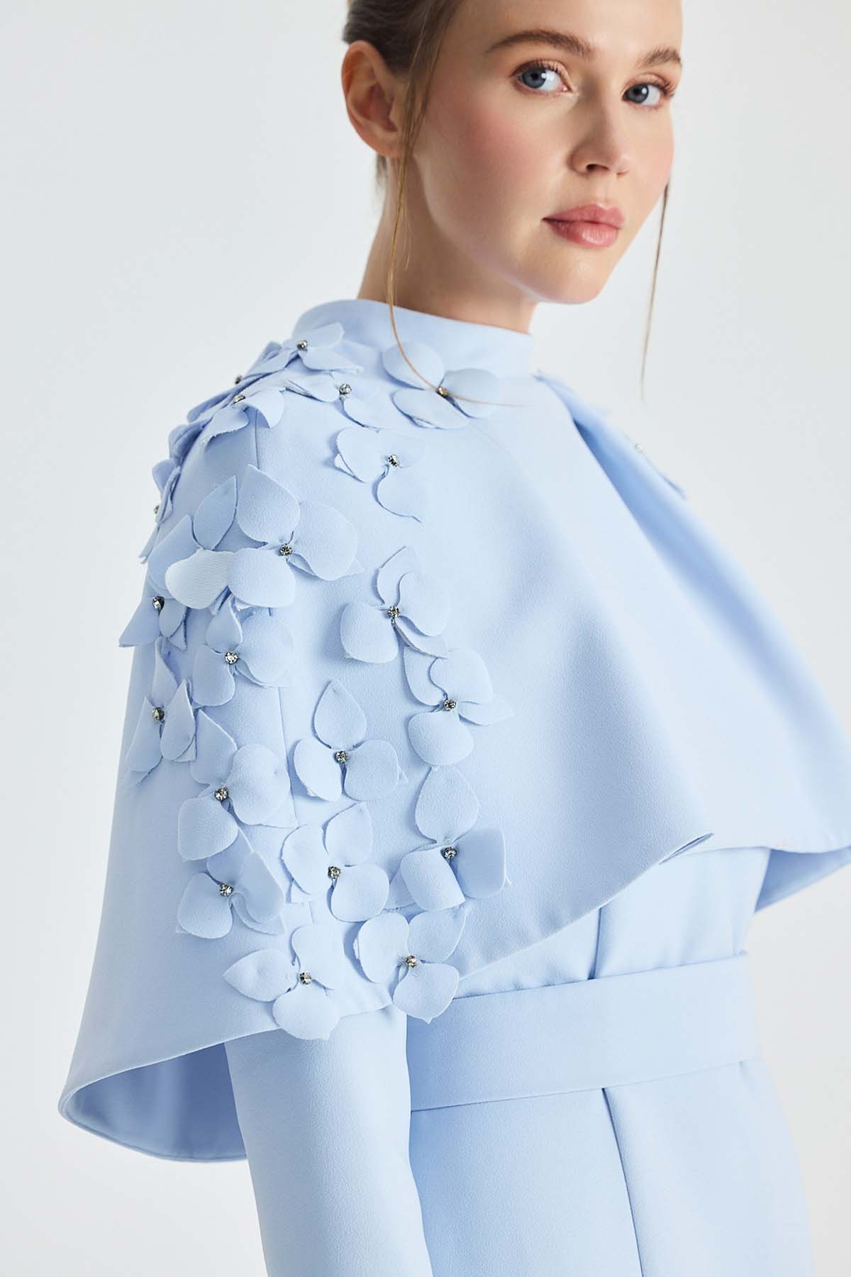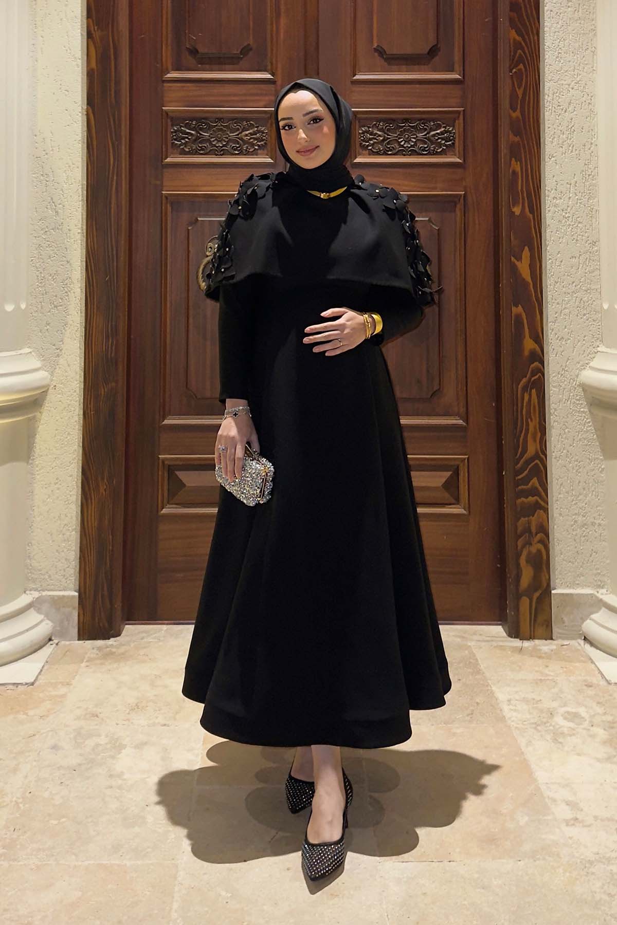 Ürün ortalama 130 cm. Ürünün arkası fermuarlıdır, astarlıdır. Krep kumaştan hazırlanmıştır. Omuz kısmında el işçiliği ile hazırlanmış çiçek detayları mevcuttur. Kloş etek formuna sahiptir.