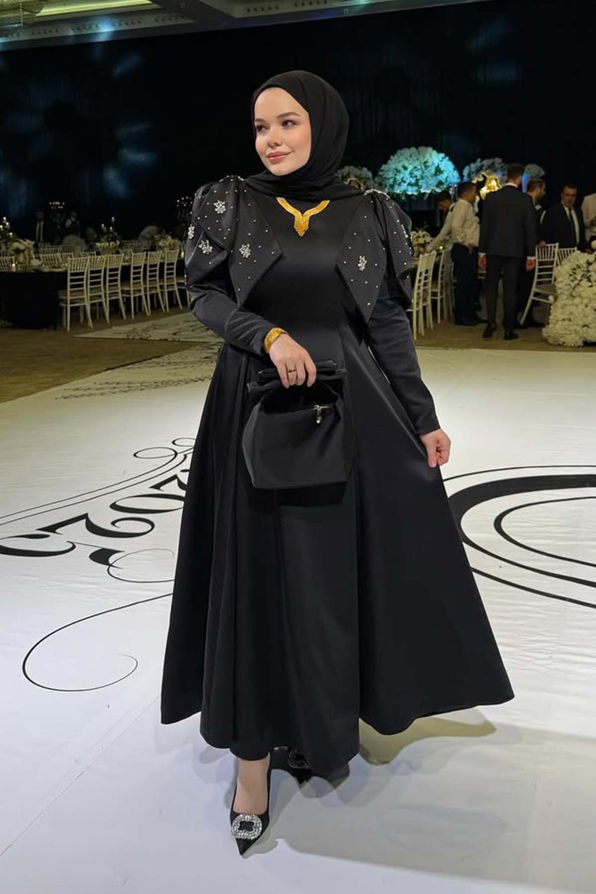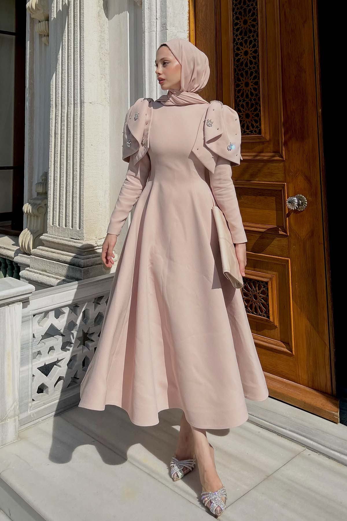 Ürün ortalama 130 cm. Elbisenin arkası fermuarlıdır, astarlıdır. Krep kumaştan hazırlanmıştır. Omuzların kat kat işlemeli parçalar kullanışmıştır. Özel taşlarla özenle el işçiliği ile işlenmiştir.