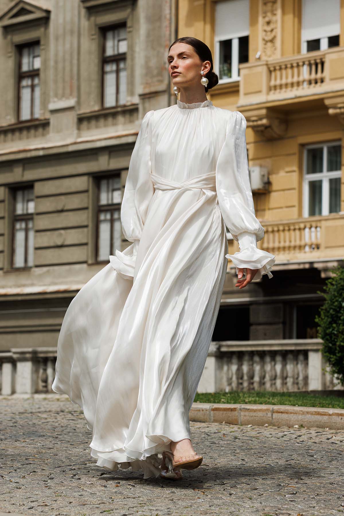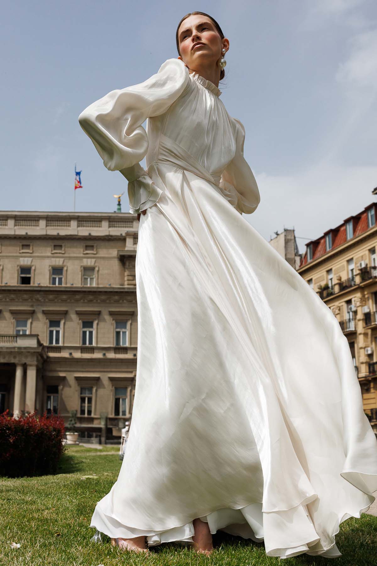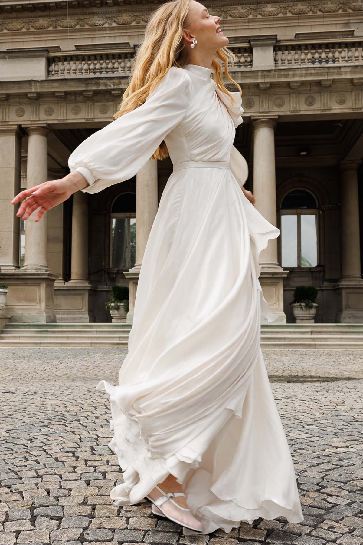 Ürün ortalama 155 cm. Ürünün arkası fermuarlıdır, astarlıdır. Özel üretilmiş ipek kumaş ile hazırlanmıştır. Kolları volanlıdır. Kloş kesimdir.
