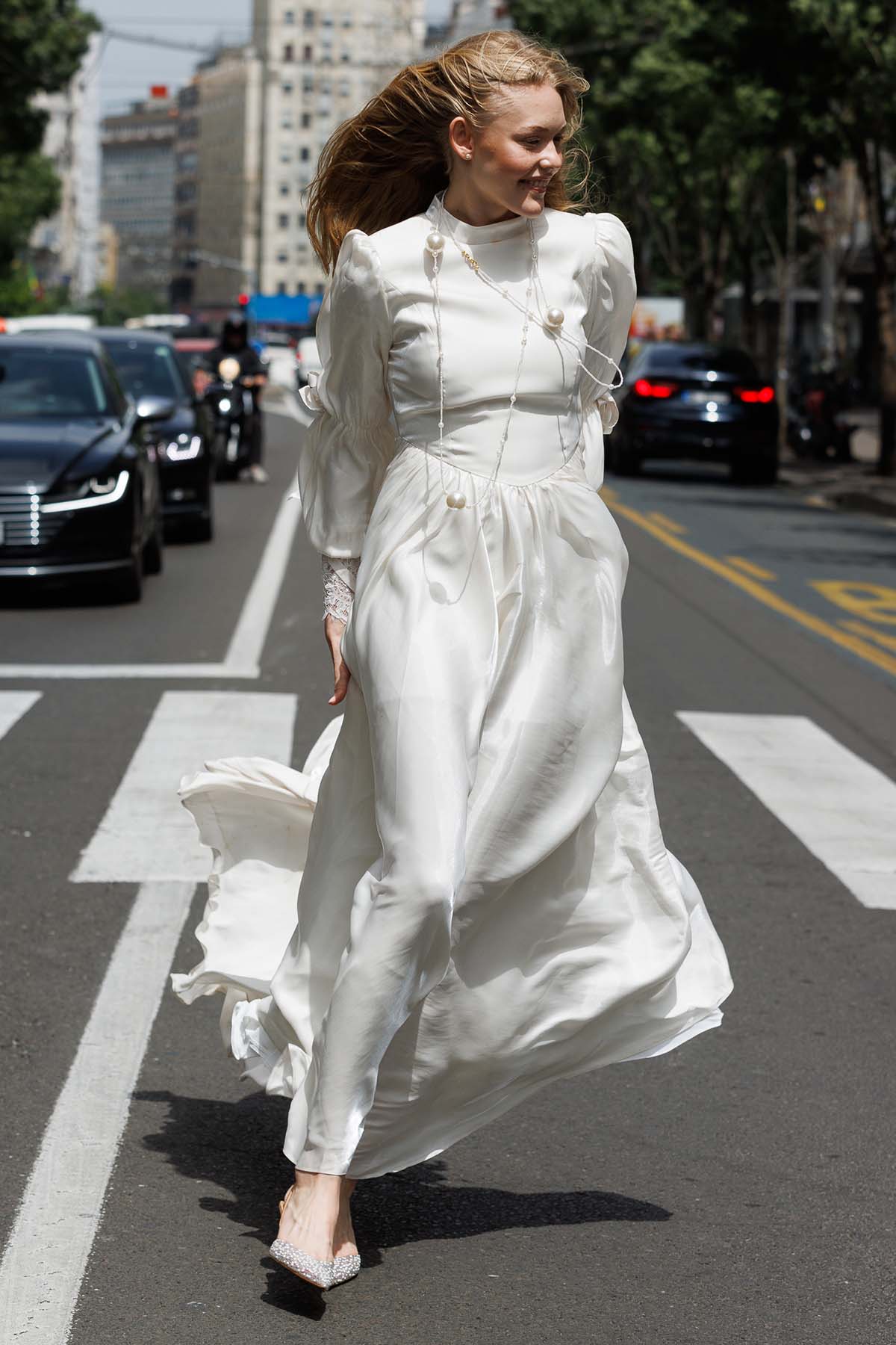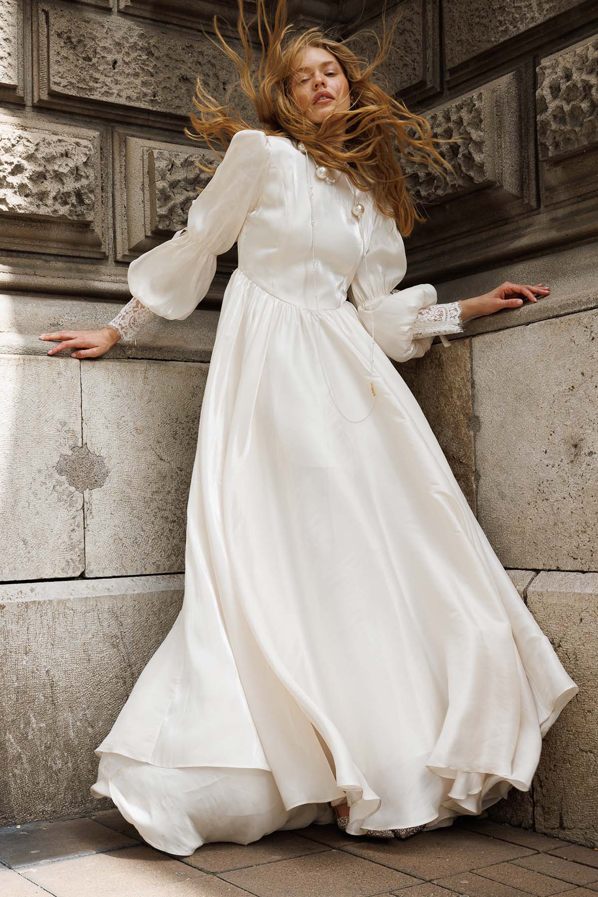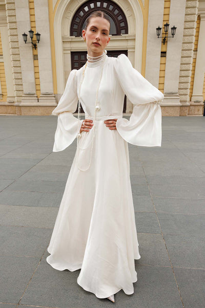 Ürün ortalama 170 cm. Ürünün arkası fermuarlıdır, astarlıdır ve kuyrukludur. Özel üretilmiş ipek kumaş ile hazırlanmıştır. Kollarında dantel detayı mevcuttur. Kloş kesimdir.